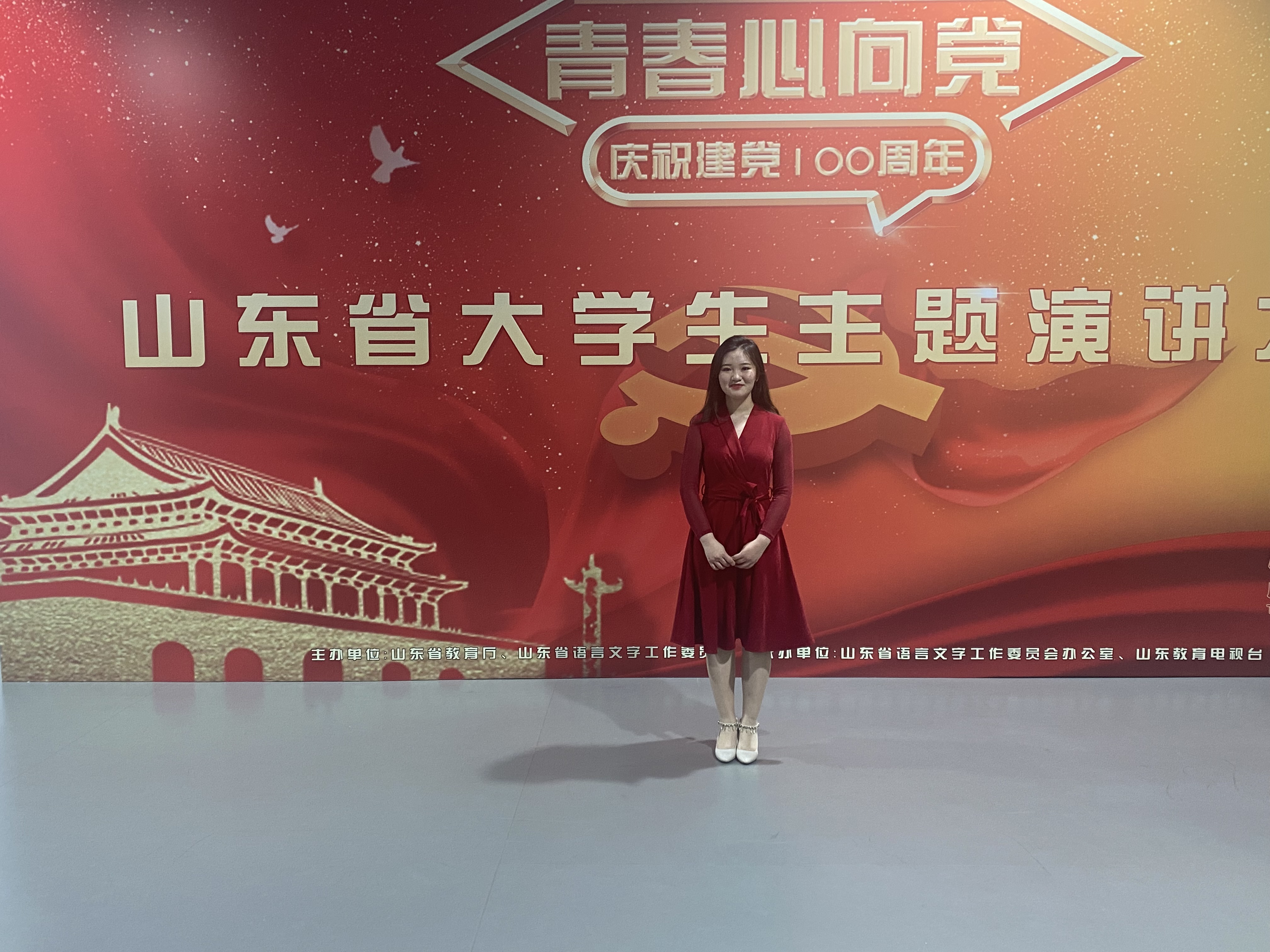 5月24日,主题演讲比赛决赛在山东教育电视台1000平方米演播厅举行,经过初赛、复赛的磨炼及指导教师的点评指导,站在决赛赛场上的闫真真表现更为从容,党史故事和自身感悟结合的更加紧密,演讲内容真挚感人,最终获得山东省大学生“青春心向党”主题演讲比赛的三等奖。