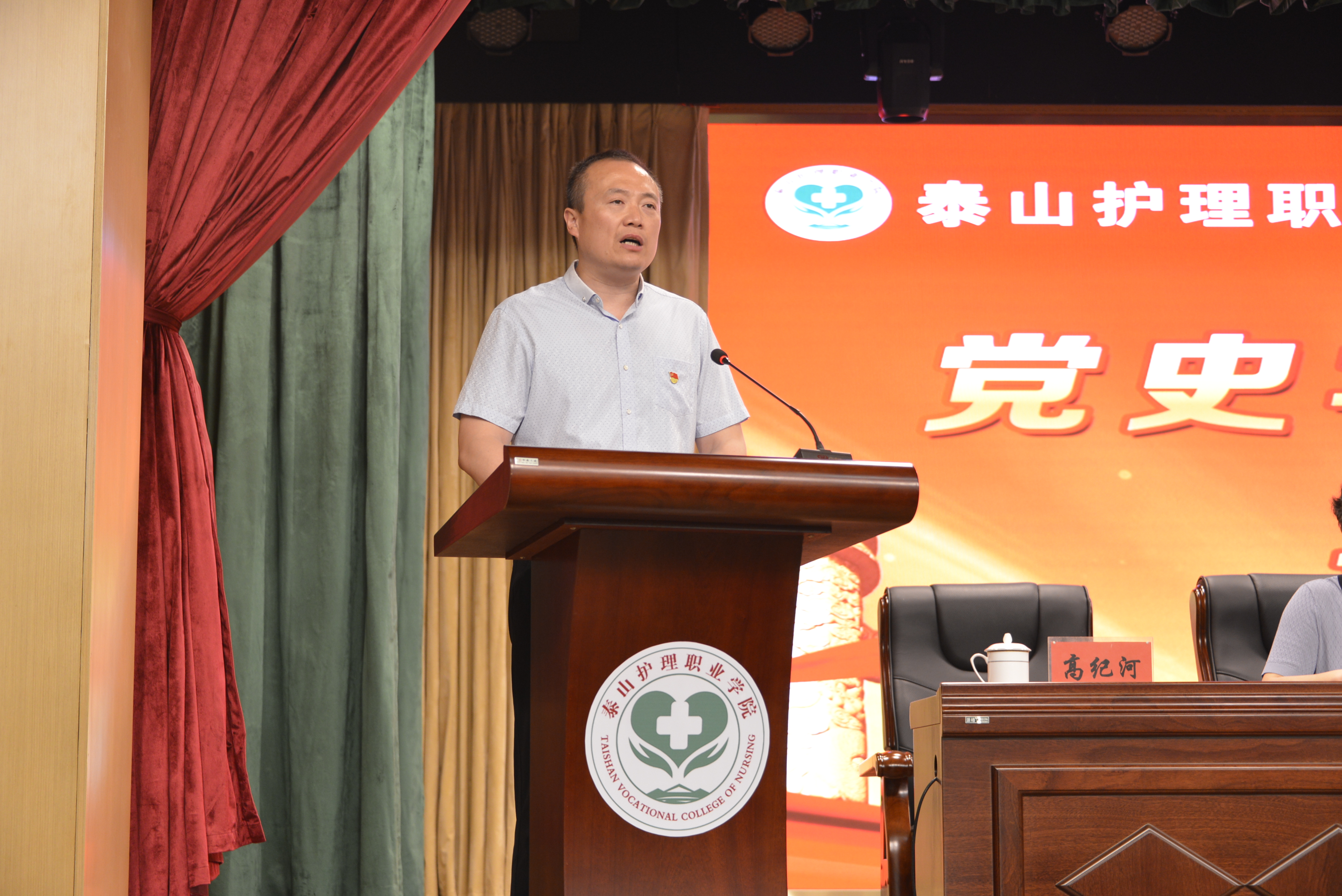 党委书记孙兰俊围绕着学院前期党史学习教育开展情况、个人学习感受以及下一步的工作安排讲了意见。他说,前期学院党史学习教育突出以学为先,在深学细学上下功夫;突出思想引领,在明理增信上树标杆;突出实事办实,在崇德力行上见实效;突出结合融入,在知史奋进上求突破,总体学习效果明显。在谈到个人学习体会时,孙兰俊主要总结了四点感悟:先进的思想理论是正确指引,必须始终把牢马克思主义中国化的科学理论体系;坚强的领导核心是根本保证,必须始终坚定中国共产党领导的核心地位;坚定的为民初心是永恒使命,必须始终坚持以人民为中心的发展思想;过硬的纪律作风是有力保障,必须始终坚守和弘扬党的优秀传承。孙兰俊指出,开展党史学习教育,是我们党政治生活的一件大事,是全院各级的一项重要政治任务。他要求,进一步提高政治站位,全面深入推进党史学习教育;创新方式方法,不断提高学习教育成效;做好结合文章,努力把学习成果转化为工作动力;压实工作责任,着力抓好各项任务落实。知史爱党、知史爱国,求真务实、奋发有为,用实干笃行书写初心使命的新答卷,加快一流护理职业学院建设步伐,以优异成绩庆祝建党100周年。