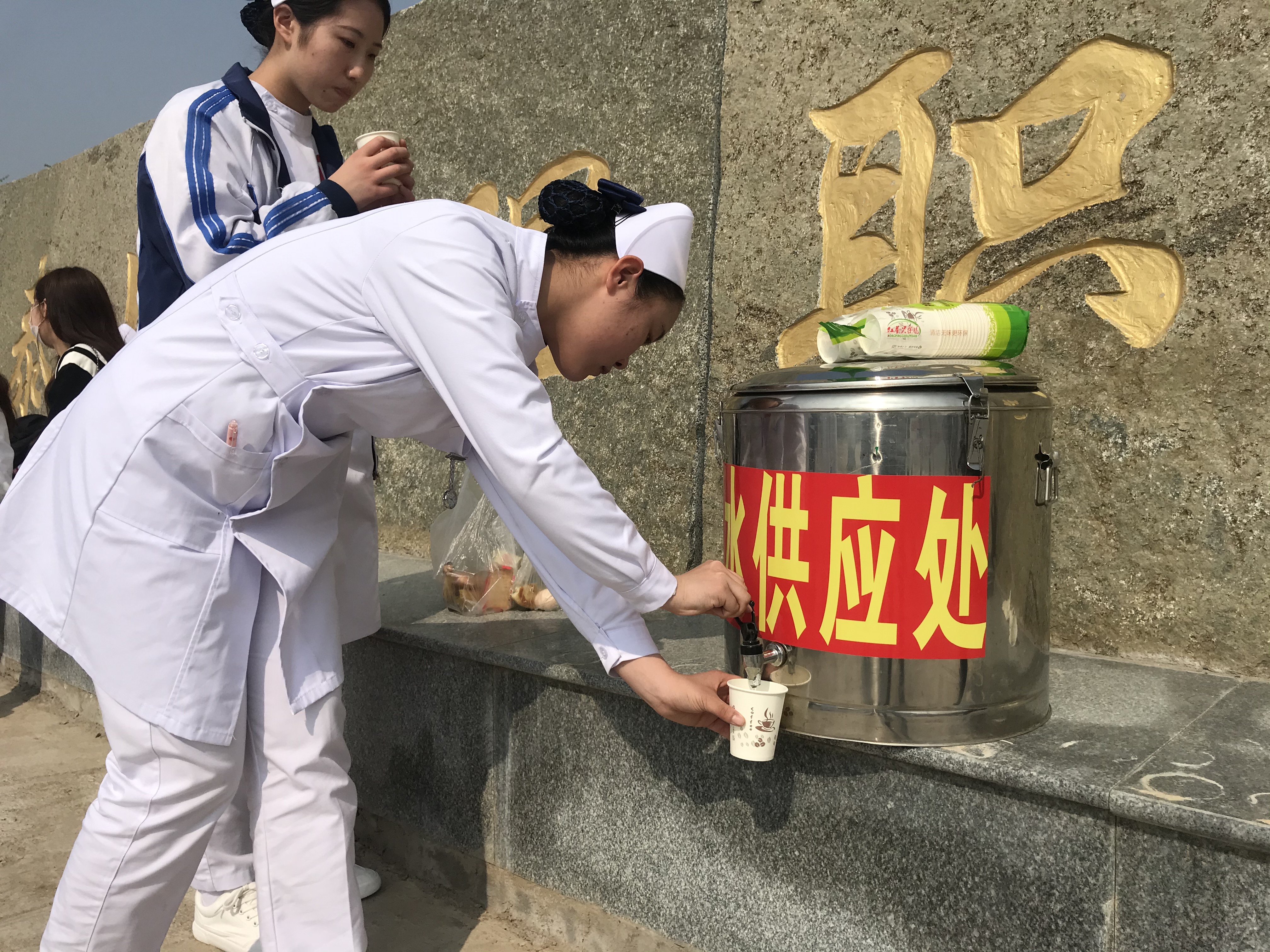 因考试过程中天气炎热,加之学院南大门附件无商店,为便于考生和陪考人员饮水,在南大门附件执勤的四支部党员专门协调来热水桶放置在大门外,并自掏腰包购买纸杯,方便考生饮水,“你们考点的服务太周到了,工作人员也和蔼可亲,这两天麻烦你们了,谢谢!”莒县的陪考老师张燕感谢说。