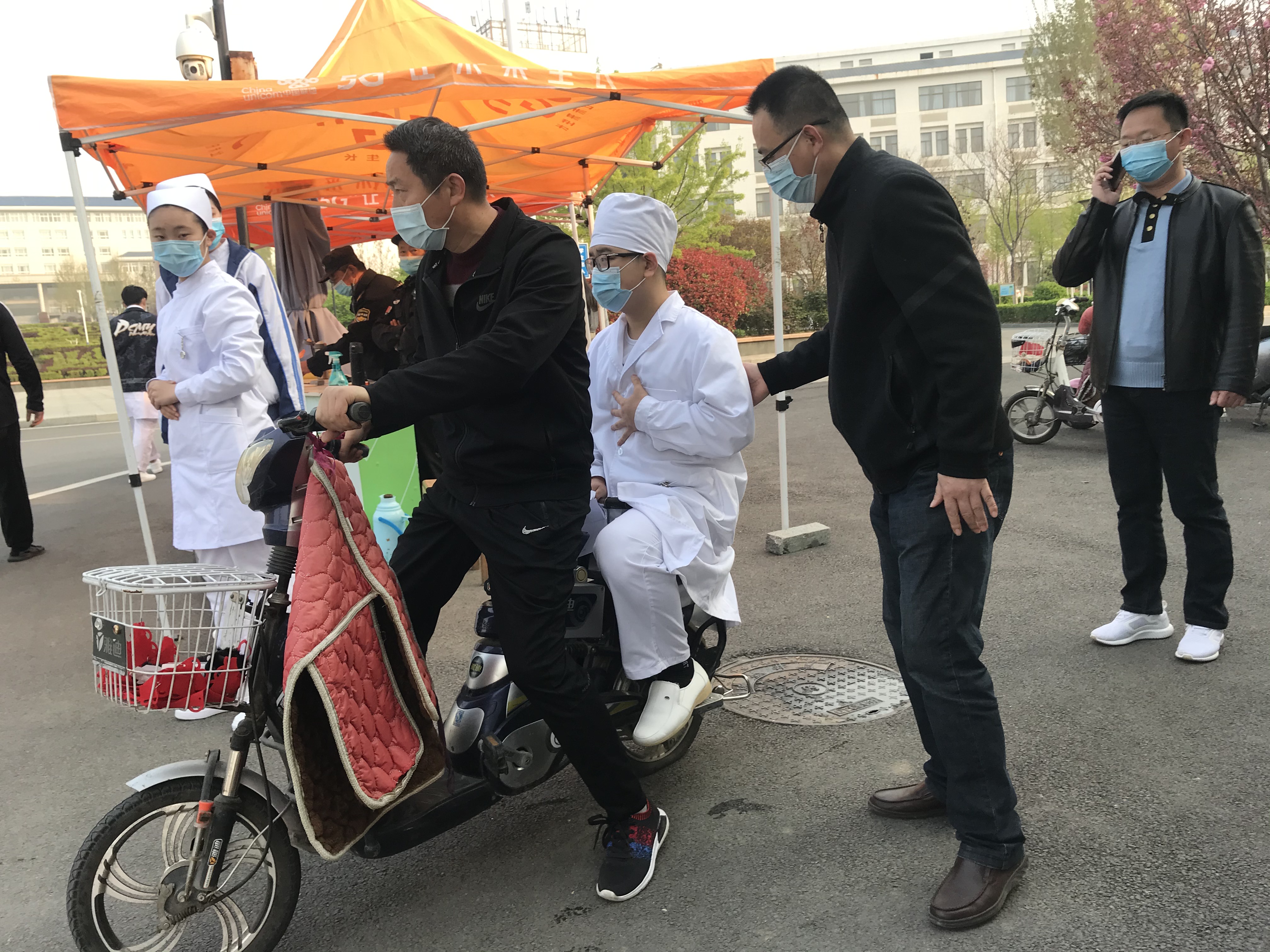 4月8日8时许,大部分考生行色匆匆地排队进场过程中,一名考生在陪考老师的搀扶下缓慢跟行在队伍末尾,四支部党员李崇岭、李祥雷见状立即上前询问,经了解,该考生名叫冷金恩,来自潍坊,因考前发生意外状况导致肋骨骨折,考试当天尚未痊愈,行动不便。了解到这一情况后,为尽可能地减轻考生疼痛,减轻伤病对考试影响,两名老师随即决定用电动车将该考生送至考点,考生结束后,考生冷金恩和陪考老师专门到李崇岭、李祥雷面前鞠躬道谢。