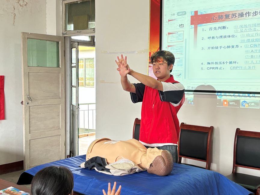 蔚蓝天空下,学院健康与管理系健康同行志愿服务队到达岱岳区夏张镇,开启“三下乡”的征程,用实际行动诠释“健康入乡,知识惠民”的深刻内涵。志愿者们围绕应急救护、公共卫生、心理健康及老年关怀等多个维度展开,为村民和孩子们带来一场丰盛的健康知识盛宴。