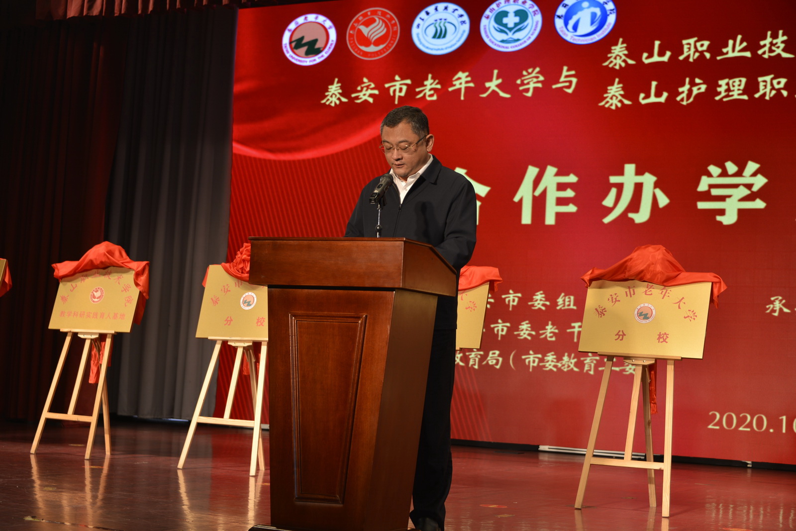 为落实“健康中国2030”战略,推动我市职业教育与老龄教育协同发展,建立老有所学的终身学习体系,满足市区老龄人口健康生活、学习等需求,由市委组织部统筹协调,经各方积极筹备、友好协商,包括新葡萄在内的四所市属职业院校与市老年大学合作办学的启动仪式在老年大学四楼演播厅隆重举行。市委常委、组织部长高尚山,市人大常委会副主任曹步山,副市长常绪扩、市政协副主席姚霆,部分市老年大学在校及毕业的市级老领导,学院党委副书记、院长辛海明及其他三所高校主要负责人,市委离退休干部工作领导小组成员单位负责同志,学院党委副书记马腾文及其他高校分工负责同志出席会议。