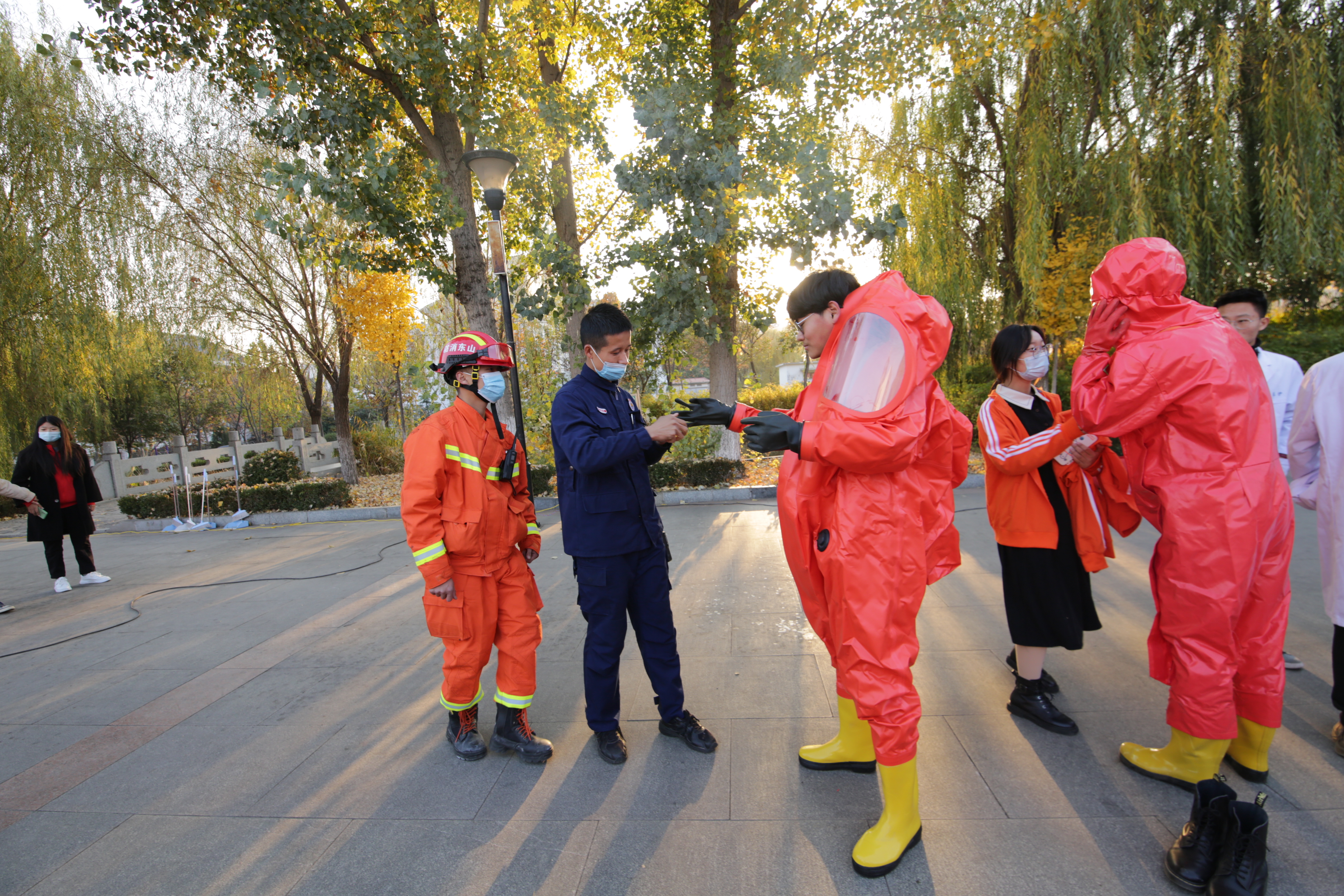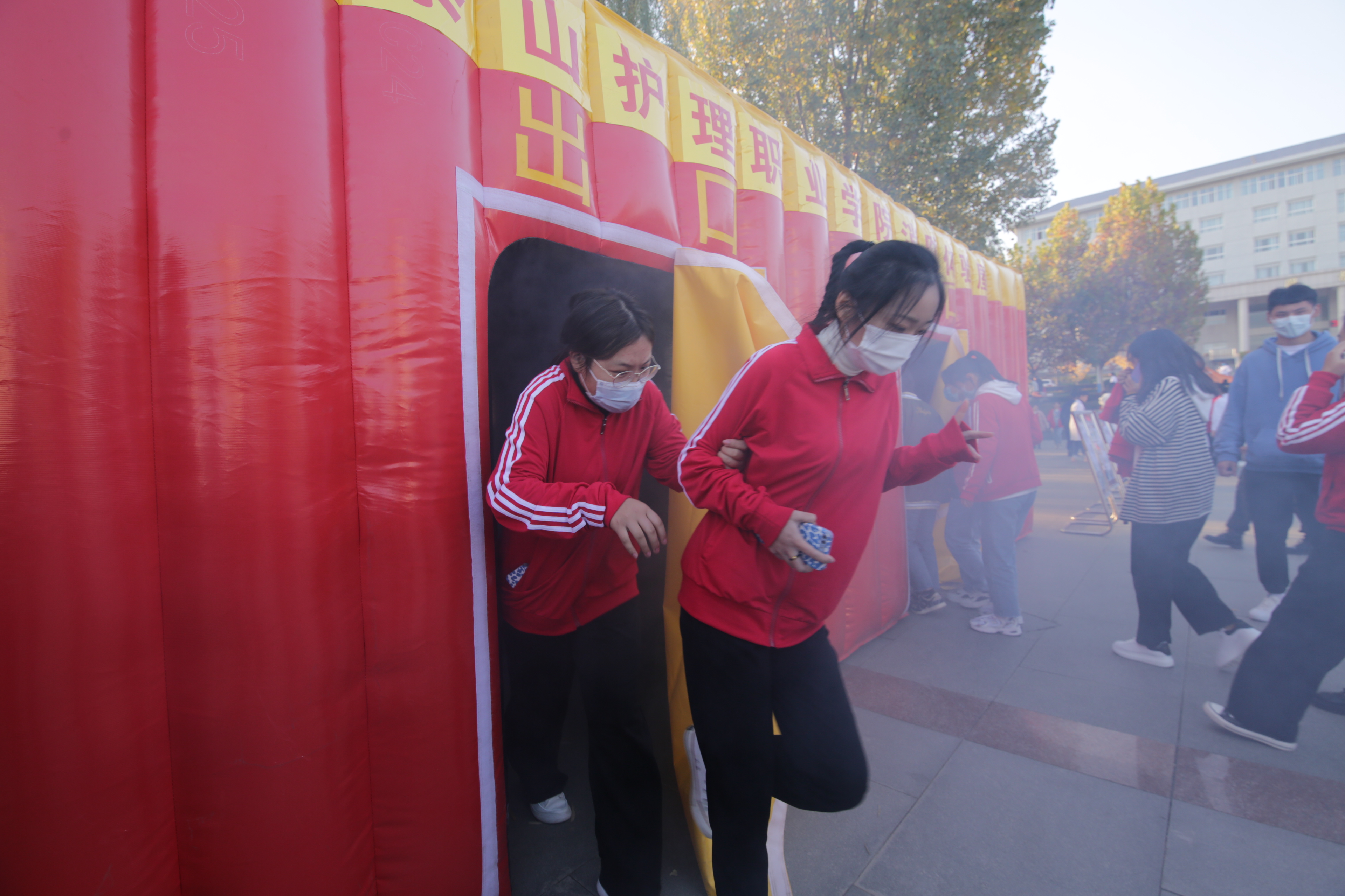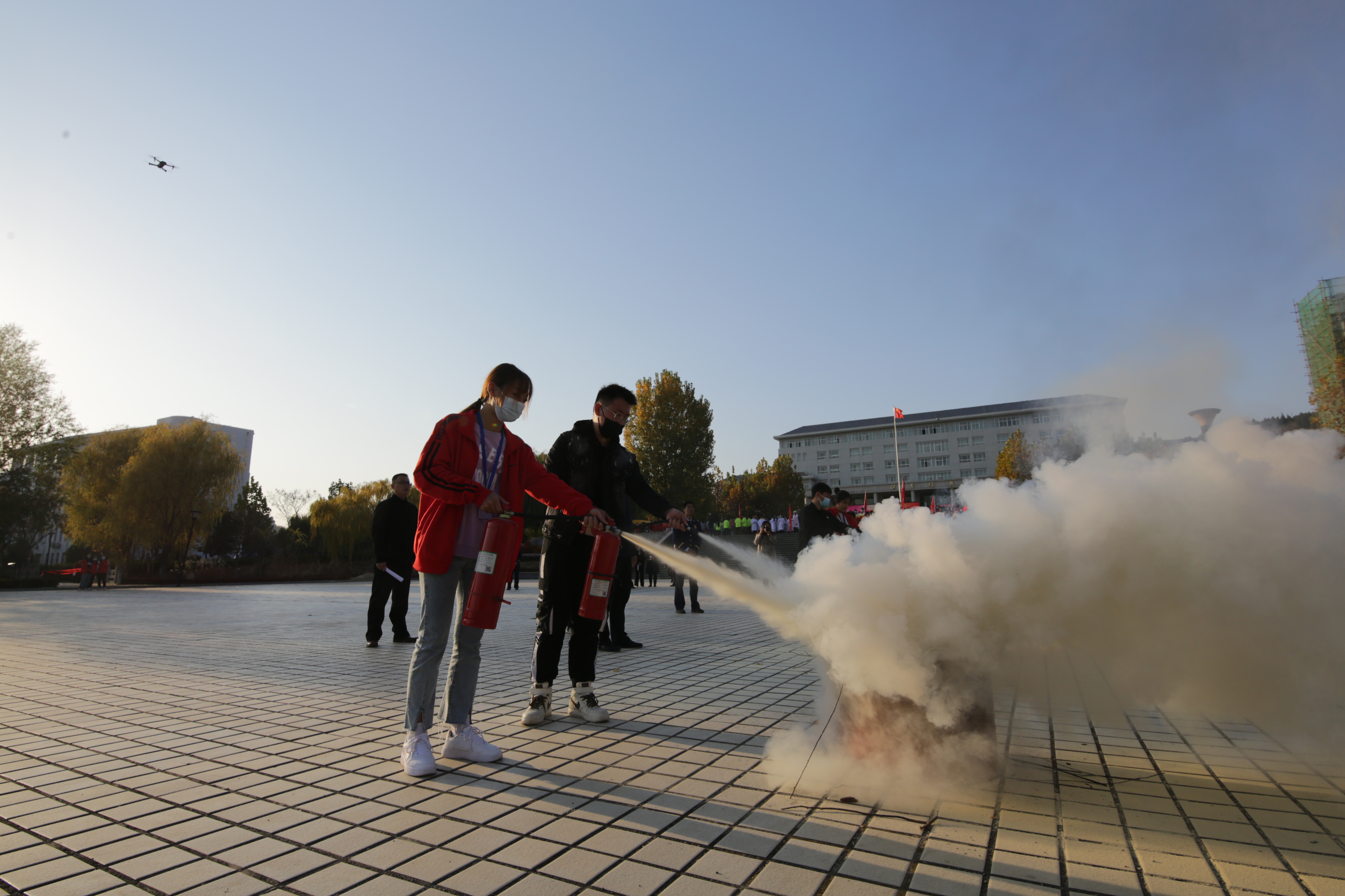 观看完逃生缓降后,参加仪式的学院领导、处室系部负责人参观了消防装备展示,并来到体验区亲自体验触电、逃生屋逃生、灭火器扑灭初起火灾。