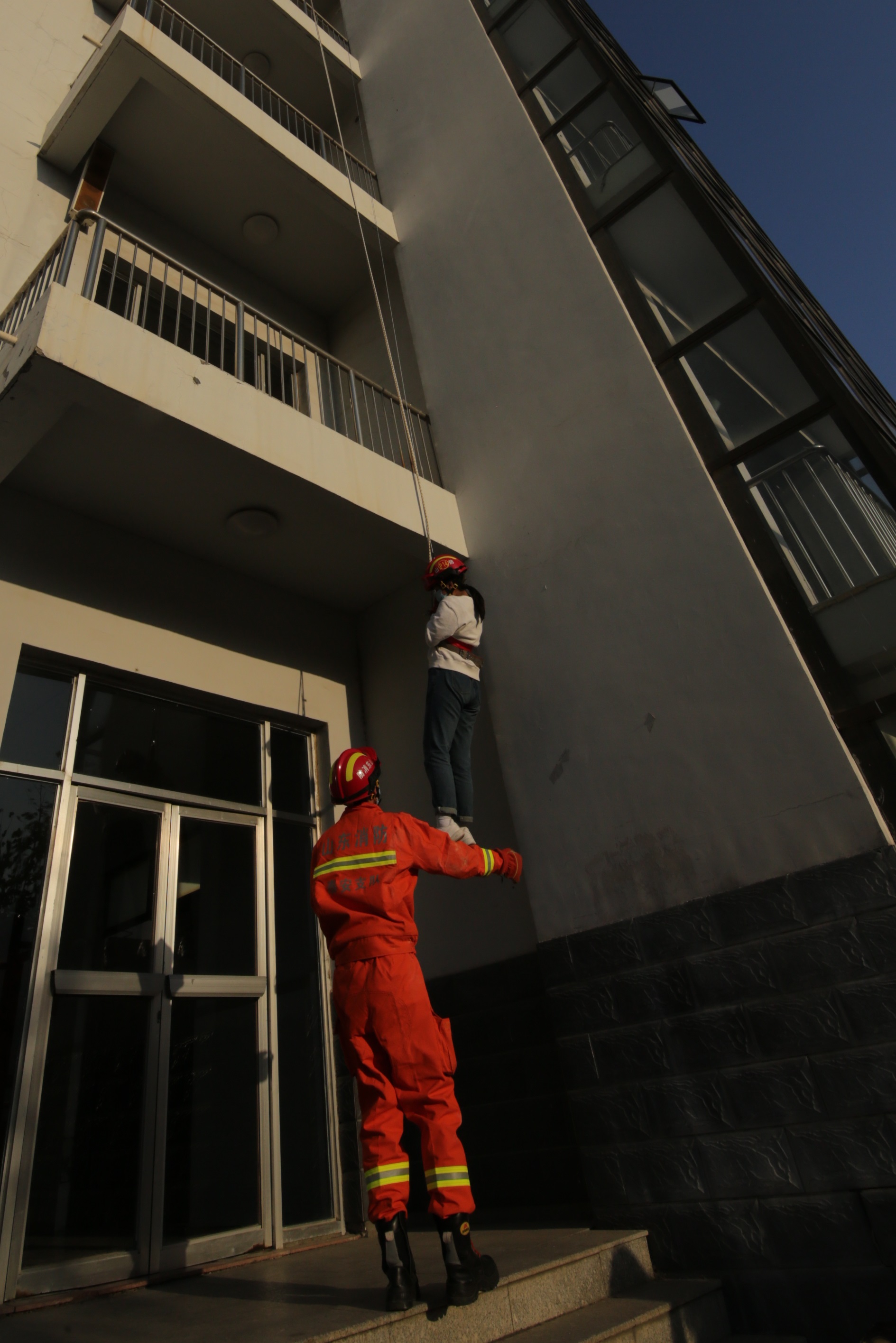 随后,伴随着主持人的介绍,一名女生在岱岳区消防救援大队专业人员的指导下利用逃生缓降器从5楼缓缓降落,“原来逃生缓降器是这样使用。”“这女孩子好大胆。”现场不时有学生小声议论着。岱岳区消防救援大队队员介绍,逃生缓降器是一种常见自救装备,由挂钩(或吊环)、吊带、绳索等组成,低层着火时人可以沿绳缓慢下降越过着火层抵达安全营救区域,适用于普通家庭和个人使用。