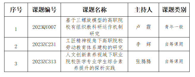 其中,山东省教育科学规划领导小组办公室发布了《山东省教育科学“十四五”规划2023年度课题立项名单》,新葡萄共3个项目获批,实现了在山东省教育科学研究院规划课题立项数目的历史性突破。山东省教育科学“十四五”规划课题是着眼“十四五”山东省教育改革发展的新趋势和新要求,为解决我省乃至国家教育发展中的难点、热点和堵点问题而设立的课题。新葡萄积极组织申报、严格把关质量,最终3个项目获批,卢霞老师的《基于三螺旋模型的高职院校有组织教科研运作机制研究》获批青年一般项目,获得上级资助经费1万元;李晖老师的《工匠精神视角下高职院校劳动教育体系建构的研究》和张腾腾老师的《人文创新素养视域下职业院校医学专业学生综合素养提升的探析与实践》获得自筹课题立项。