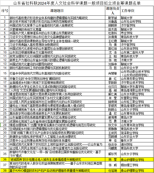 同时,山东省社科联2024年度人文社会科学课题一般项目自筹经费课题名单公示,学院两位老师的课题成功立项,分别是陈莹老师《“进城困养”的女性随迁老人城市生活幸福感提升策略研究》与任延艳老师《基于KANO模型的农村产妇产后访视护理服务质量提升策略研究》。