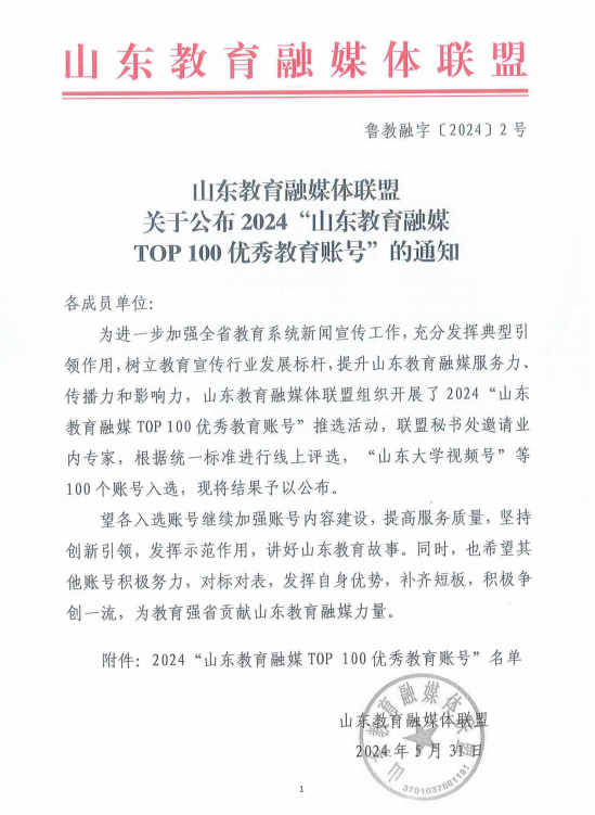 近日,山东教育融媒体联盟发布《关于公布2024“山东教育融媒TOP100优秀教育账号”的通知》,新葡萄8883官网AMG官方微信公众号顺利入选。