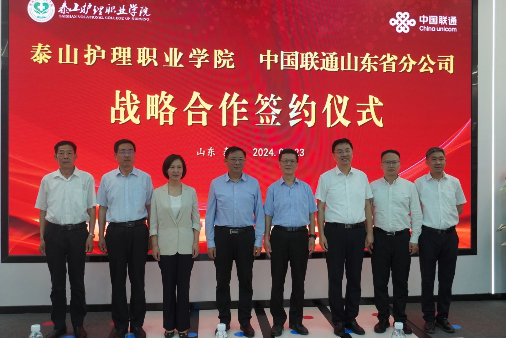 学院党委书记黄正玉,党委副书记、院长荆丽艳,党委委员、副院长张宗起,山东联通科技创新部总经理付翔,泰安联通党委书记、总经理亓健出席签约仪式。学院党委委员、办公室主任王建伦及相关部门负责人,省、市联通公司有关人员参加活动。荆丽艳、付翔分别代表学院与联通公司致辞,对双方开展合作共建表示祝贺。