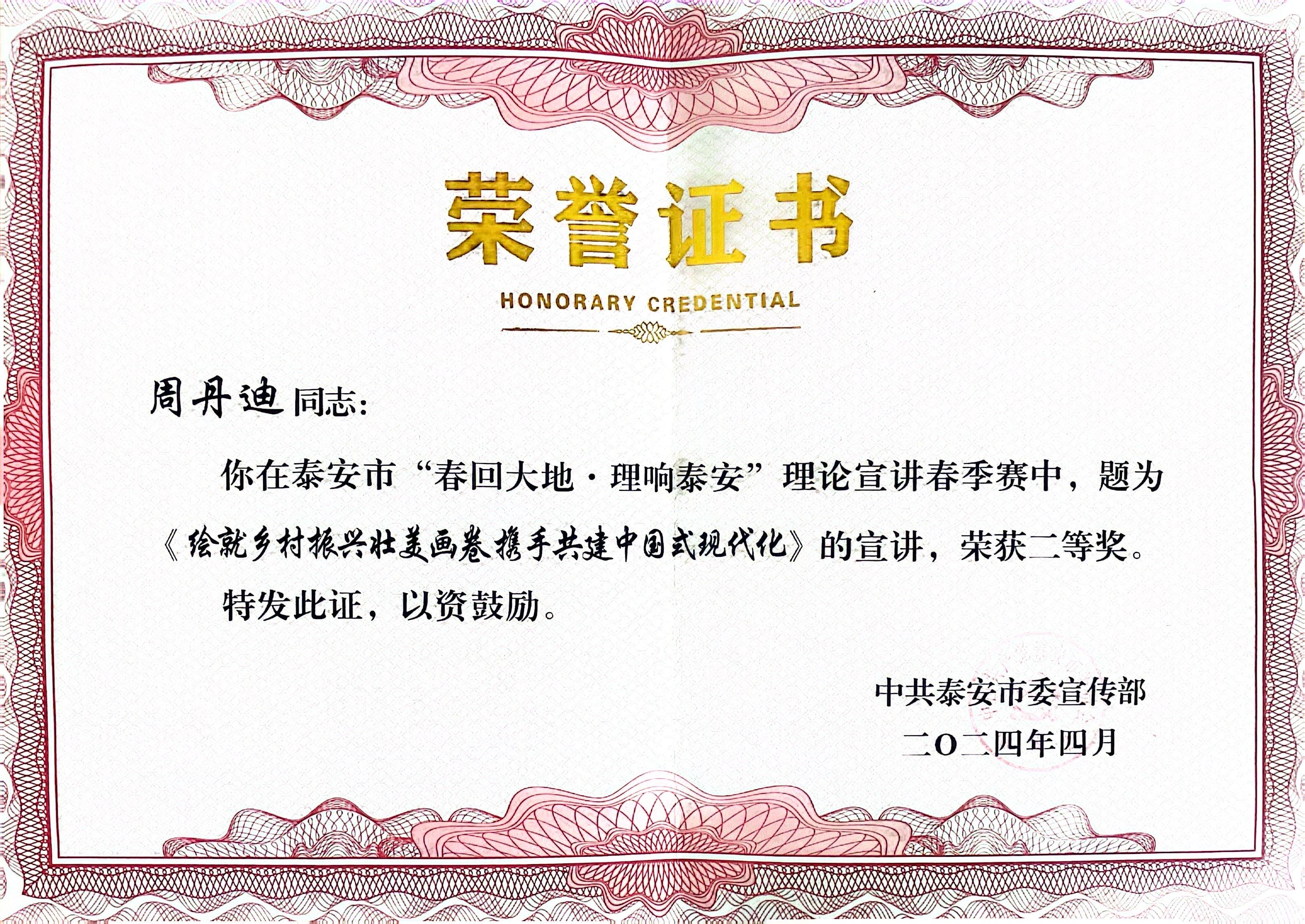 近日,学院思政部教师周丹迪在“春回大地·理响泰安”理论宣讲春季赛中凭借题为《绘就乡村振兴壮美画卷 携手共建中国式现代化》的精彩宣讲,荣获二等奖。