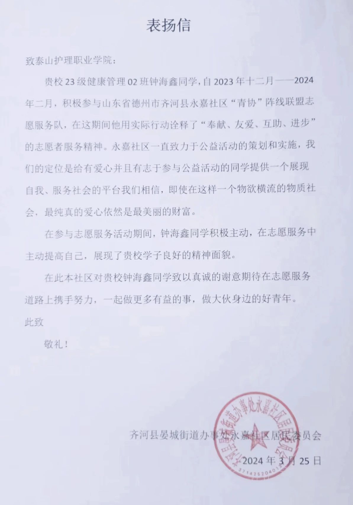 近日,学院收到一封落款为齐河县晏城街道办事处永嘉社区居民委员会的表扬信。信中写道,健康与管理系学生钟海鑫在寒假期间参加“返家乡”活动,用实际行动诠释了“奉献、友爱、互助、进步”的志愿者服务精神,对该同学提供的优质志愿服务表示表扬和感谢。