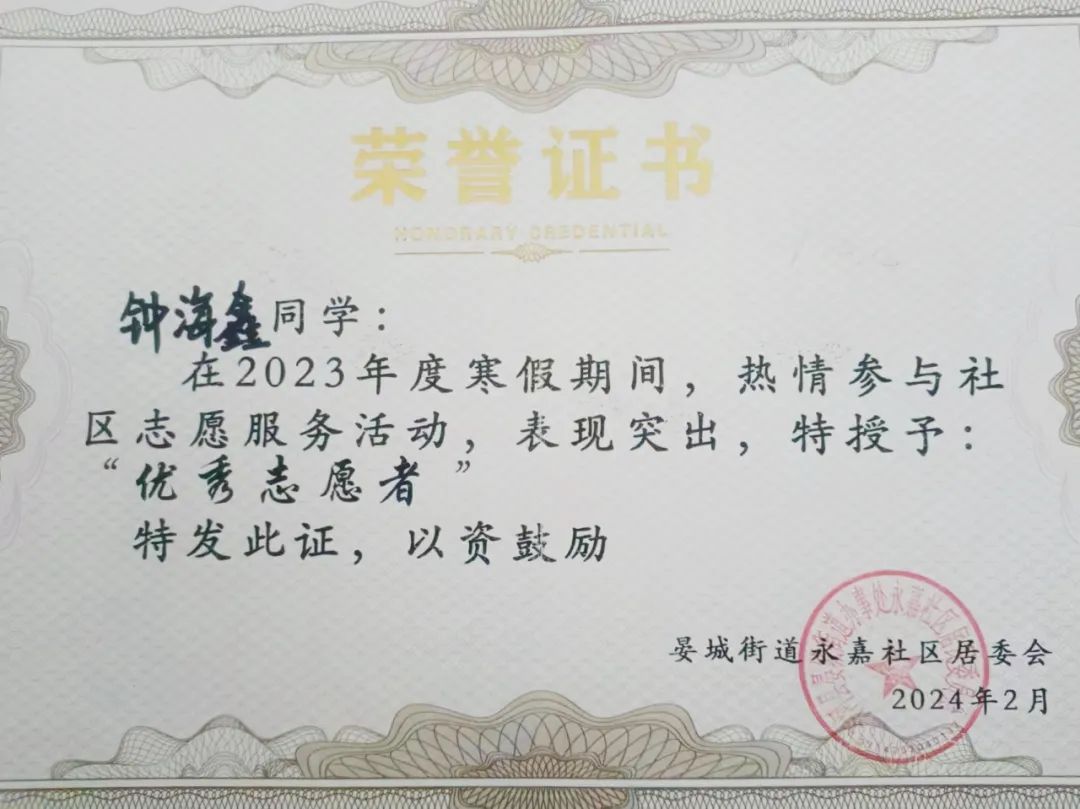 “在参与志愿服务活动期间,钟海鑫同学积极主动,在志愿服务中主动提高自己,展现了贵校学子良好的精神面貌……”