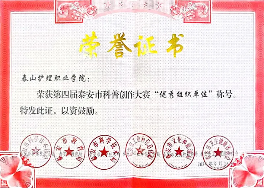学院荣获第四届泰安市科普创作大赛“优秀组织单位”称号。医学科普社的同学们取得了多个单项成绩。