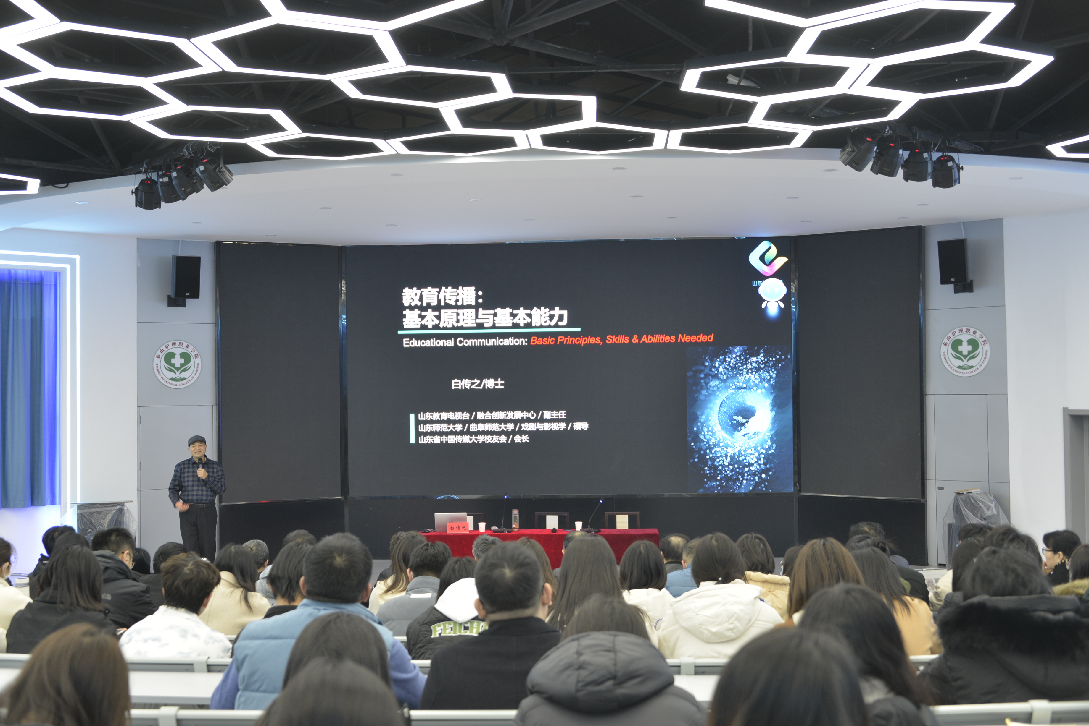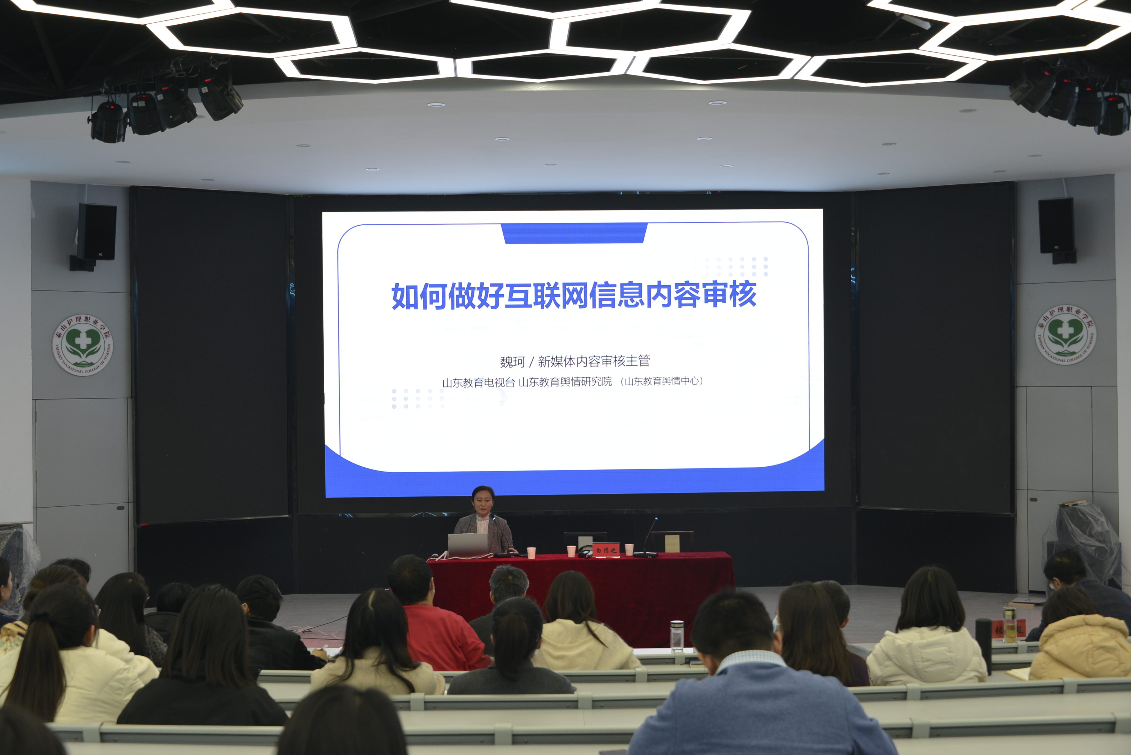 培训邀请传播学博士、山东教育电视台融创中心副主任、山东教育舆情研究院业务负责人白传之,山东教育卫视传媒中心、山东教育舆情研究院新媒体内容审核主管魏珂,为师生作教育新闻宣传业务提升专题讲座。党委委员、副院长张宗起主持培训。