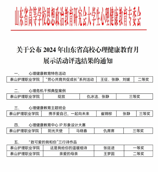 日前,2024年山东省高校心理健康教育月展示活动评选结果公布。泰护师生取得了一等奖1项,二等奖2项,三等奖3项的好成绩,充分展示了新葡萄在心理健康教育方面的成果与创造力。