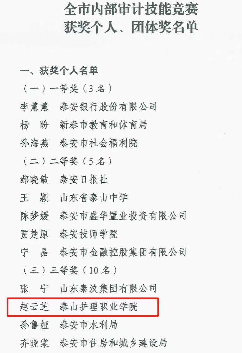 近日,泰安市“技能兴泰”职业技能大赛——2024年全市审计职业技能竞赛获奖结果公布。学院审计部教师赵云芝荣获内部审计技能竞赛三等奖。
