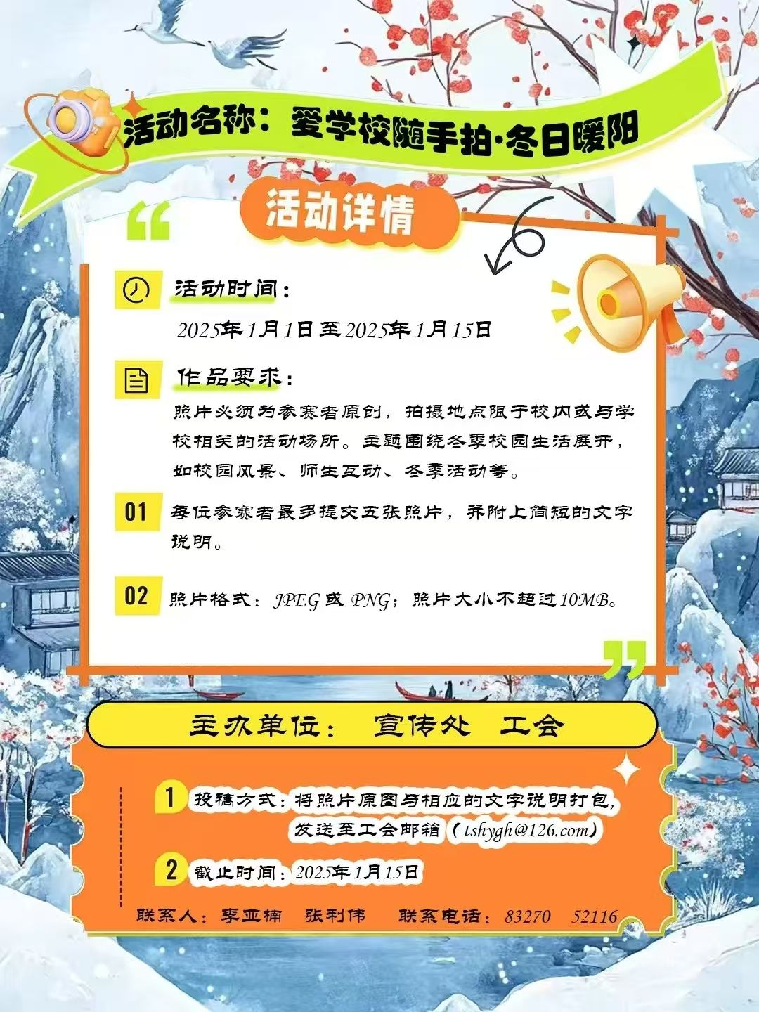 参赛者需将照片原图与文字说明打包,以 “分会-姓名-短号” 方式命名,于2025年1月15日前发送至工会邮箱(tshygh@126.com)。所有参与者默认同意作品在不损害个人权益的前提下用于学校非商业性宣传推广,学校保留对参赛照片的最终解释权。