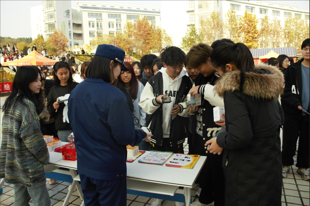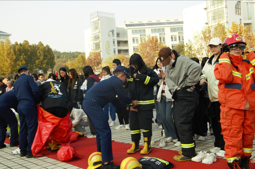 观摩完消防演练后,参加仪式的领导学院师生饶有兴致地参观了消防装备展示,并来到体验区亲自体验触电、逃生屋逃生、灭火器扑灭初起火灾、结绳等体验项目。