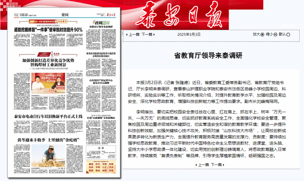 近日,省委教育工委常务副书记,省教育厅党组书记、厅长李明来泰调研,查看新葡萄8883官网AMG和泰安市岱岳区岳峰小学校园周边、科研场所、实验实训等工作,听取相关情况介绍,对提升教育教学水平、加强校园及周边安全、深化学校思政教育、增强科技创新能力等工作提出要求。副市长刘峰梅陪同。