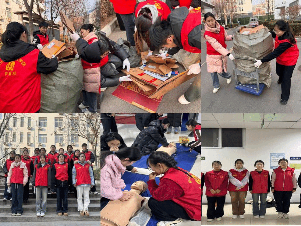 护理系“一米阳光”青年志愿服务队通过收集105.54斤废品筹得80元善款,用于贫困儿童帮扶;泰小荷志愿服务队在岱岳政府广场宣讲关爱儿童及便民服务,与蓝天救援队交流急救经验,并走访贫困家庭发放“暖心助学包”;凝益救护队完成第111次急救教学,通过实践操作强化学生技能。