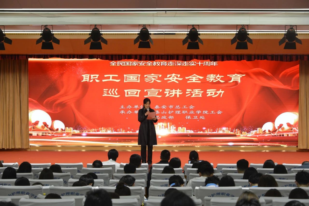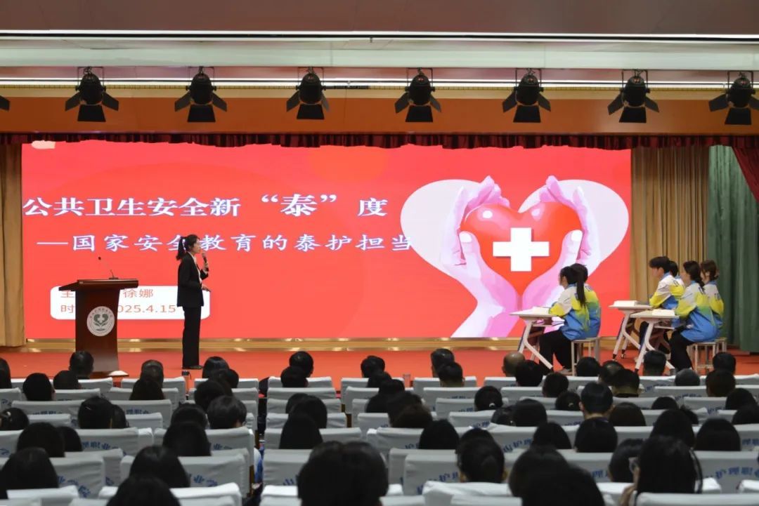 会场活动精彩纷呈,国家安全教育宣传片率先登场。随后,以《公共卫生安全新“泰”度——国家安全教育的泰护担当》为题的全民国家安全教育公开课上演。课程结合护理专业特色,讲述了李宗育、乔安花、王小焕等优秀校友的抗疫故事,深入浅出地剖析公共卫生安全与人民健康、社会稳定的密切关联,引发全体人员强烈共鸣。