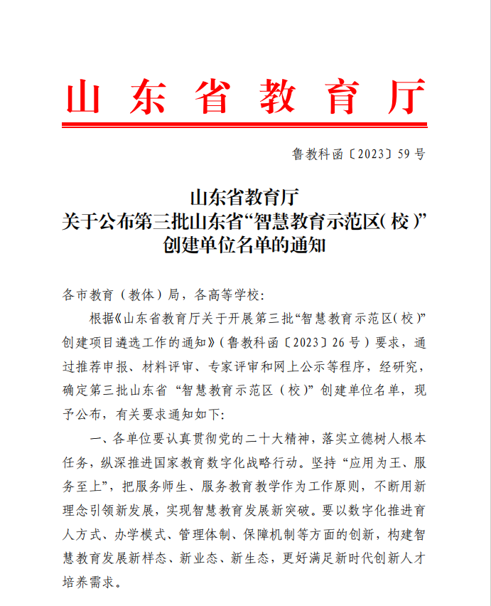 近日,山东省教育厅公布第三批省“智慧教育示范区(校)”创建单位名单,新葡萄8883官网AMG榜上有名。