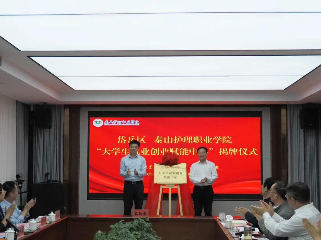 杨建全、刘国成为“大学生就业创业赋能中心”揭牌;岱岳区委常委、组织部部长、统战部部长王恩东为“引才大使”颁发聘书;学院党委副书记张建国,岱岳区政府党组成员、副区长马祥波分别汇报了校城融合工作情况。