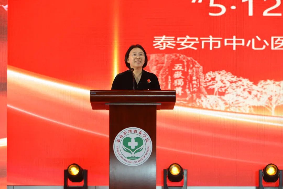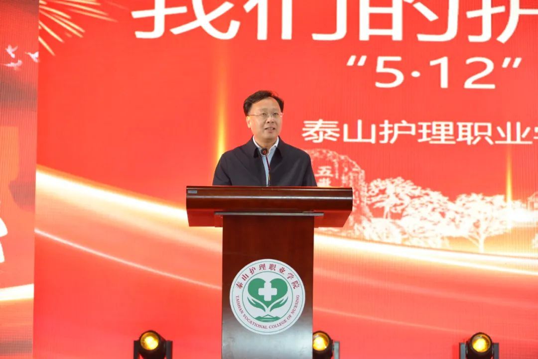 市教育局、市公安局、市卫健委、市科技局、市民政局、市妇联、市残联、团市委、市总工会、岱岳区、泰安市中心医院、武警泰安支队、泰安市消防救援支队有关单位领导嘉宾莅临现场,与学院领导班子、全体师生及医护工作者代表共庆节日,致敬白衣天使。