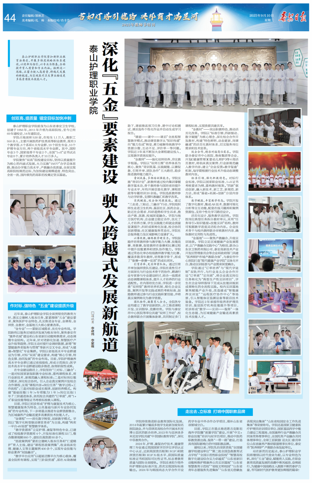言如灯塔引航路,兴邦育才满星河。9月10日,《泰安日报》发布2025年教师节特刊,44版报道学院“深化‘五金’要素建设 驶入跨越式发展新航道”的有关情况,生动诠释学院树牢使命、扎实担当的实践。