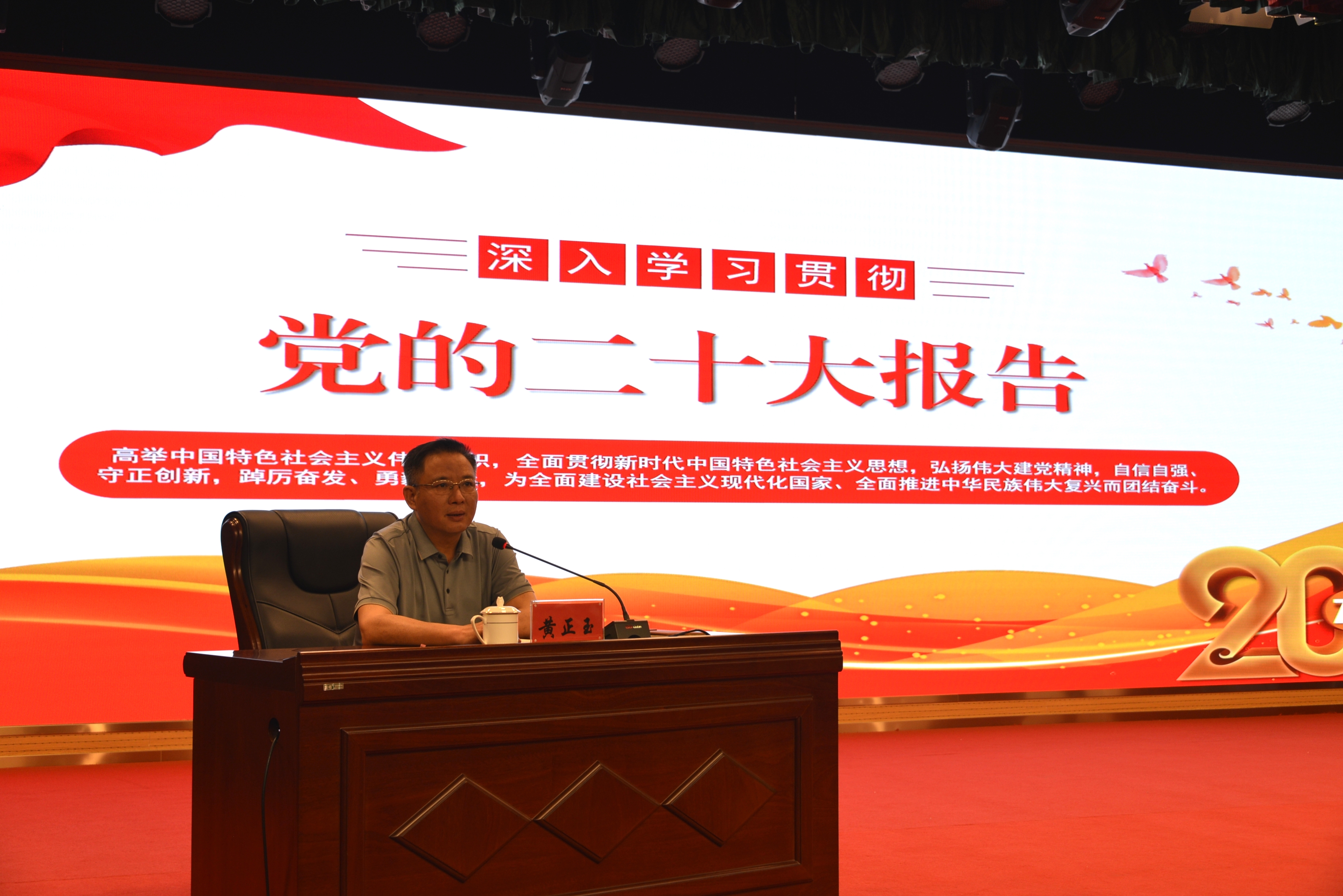 黄正玉从党的二十大的主题、主要成果,过去5年的工作和新时代10年的伟大变革,马克思主义中国化时代化,中国式现代化,全面建设社会主义现代化国家的目标任务,坚持党的全面领导和全面从严治党,应对风险挑战,坚定不移跟党走、争做新时代好青年等八个方面,带领大家共同深入学习党的二十大精神,深刻领会党的二十大重大深远的历史意义,深刻认识党的二十大主题中蕴含的丰富内涵,深刻把握习近平新时代中国特色社会主义思想的世界观和方法论,切实把思想行动统一到党的二十大精神上来,用党的二十大精神统一思想、统领全局、统揽工作,自信自强、团结奋斗,为加快建设“双高”院校而不懈努力,为现代化强市建设贡献泰护力量。