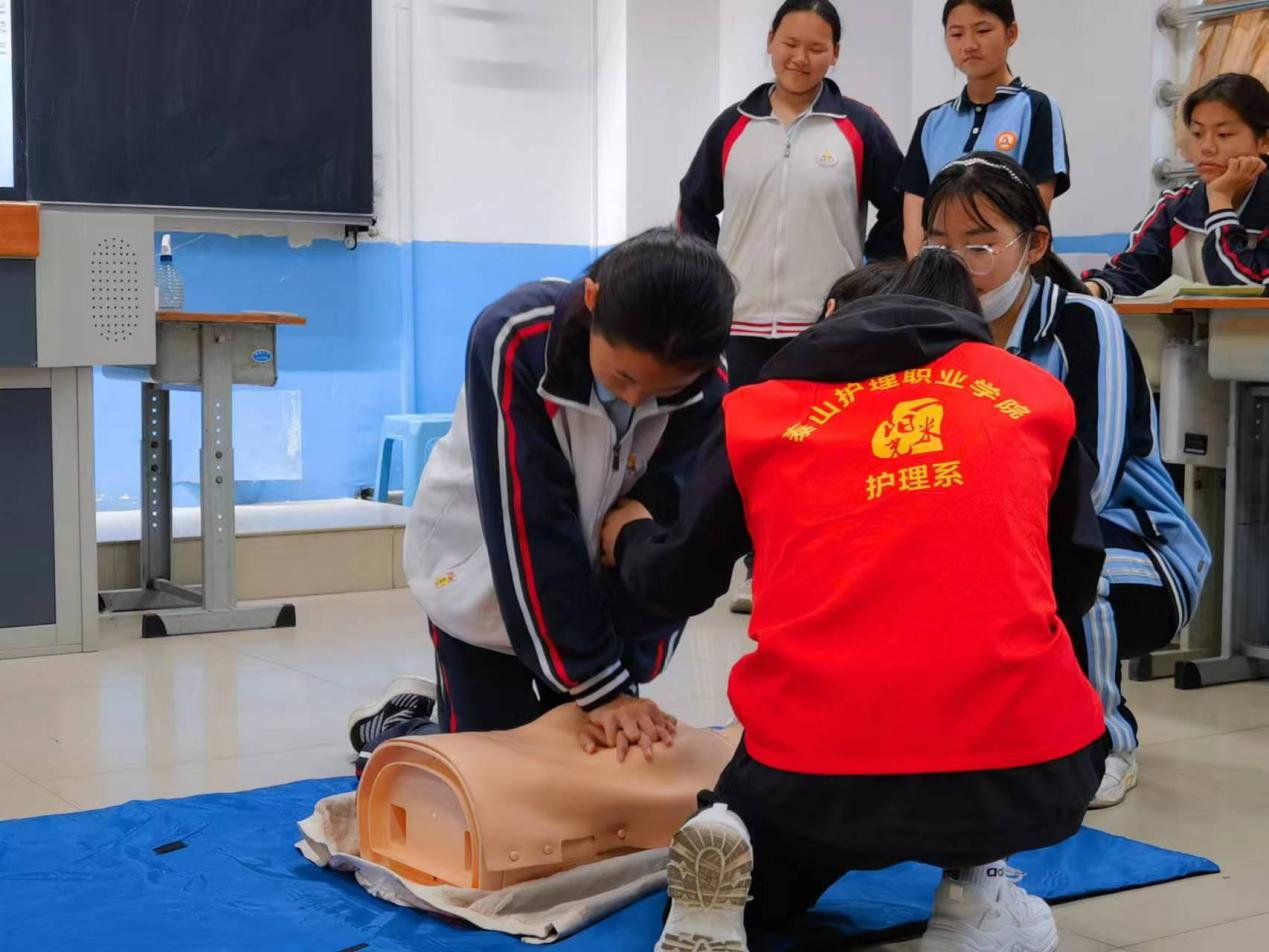 新葡萄8883官网AMG护理系学生管理科副科长陈东带队,护理系志愿者协会“凝益救护”急救小分队志愿者参加活动。山东省泰安第六中学(新校区)初二六班班主任冯东亮老师与班级全体同学参与活动。