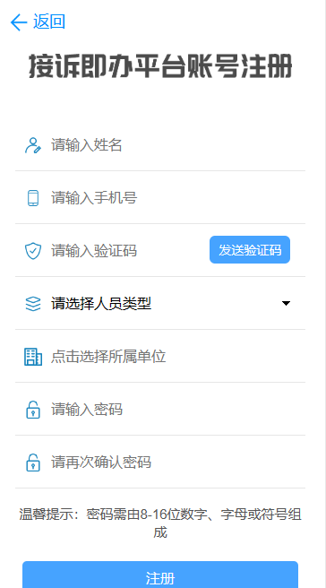 2.注册、登录。使用平台需要注册账号。在平台登录页找到“注册账号”按钮,填写真实姓名、手机号(可接收短信验证码)、人员类型、所属单位以及登录密码等信息。信息填写完成后点击底部的“注册”按钮即可完成注册,在登录页面输入注册时填写的手机号和密码即可登录。