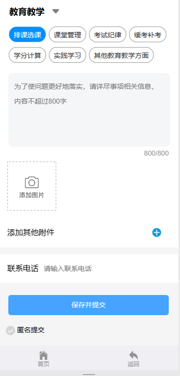 4.提交。在问题填报页面填写需要反馈问题的文字描述、需要上传的材料(照片、视频、文档等相关材料)、填写联系电话、选择是否匿名提交,填写完上述信息之后进行提交。