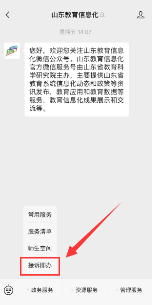 1.微信关注。微信搜索关注【山东教育信息化】公众号,找到【政务服务】-【接诉即办】菜单,点击菜单即可跳转至“山东省高校接诉即办平台”。