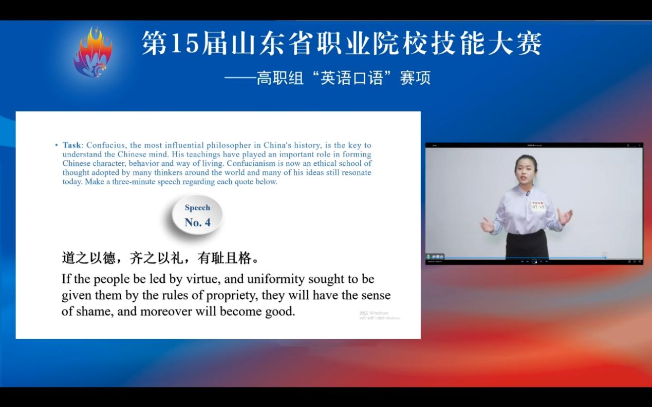 据了解,本赛项为个人赛,竞赛环节包括“中国故事(Speech)”“情景交流(Interview)”“职场描述(Presentation)”和“职场辩论(Debate)”四部分。比赛期间,学生以专业的表现和精彩的表达赢得评委赞扬,取得优秀成绩。