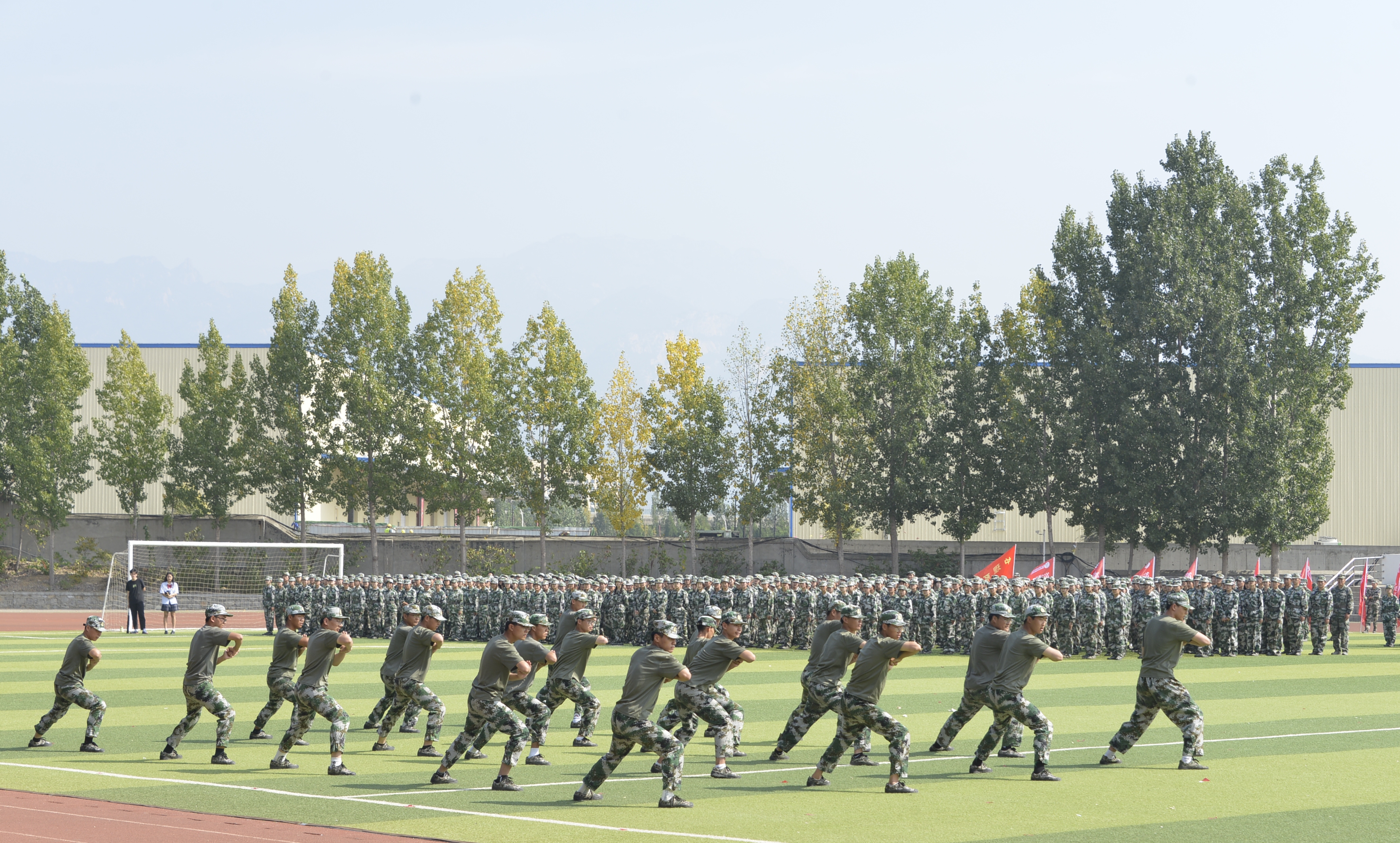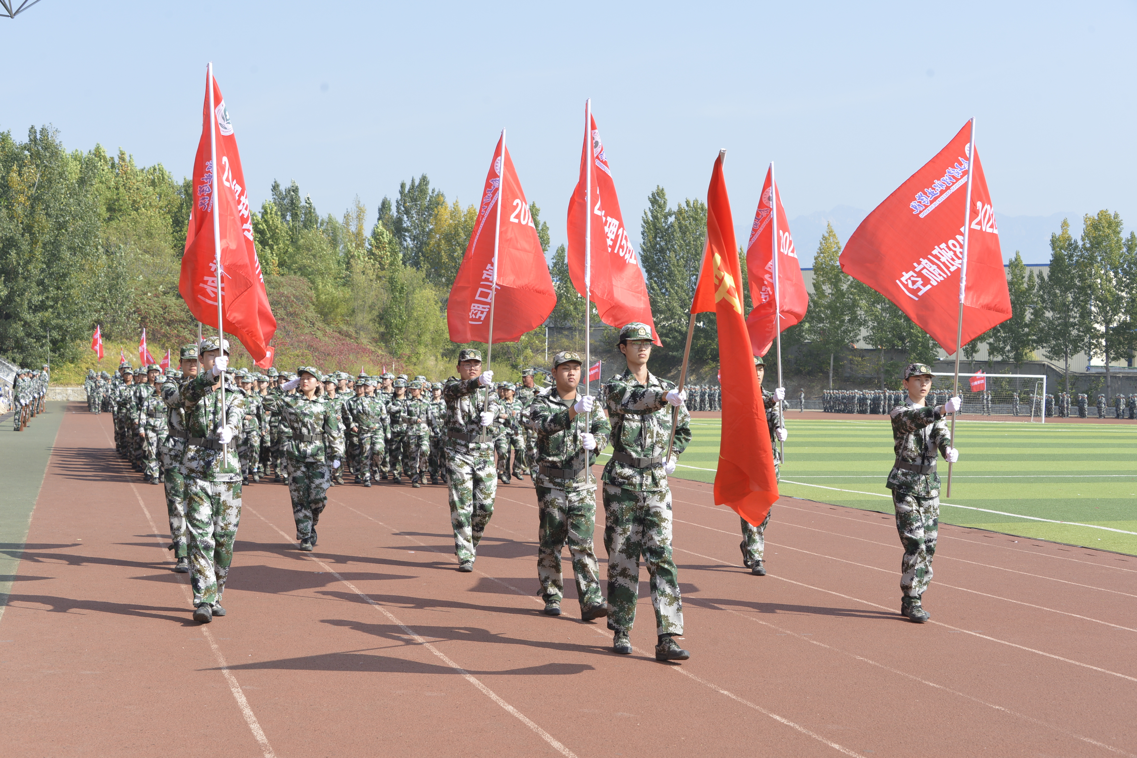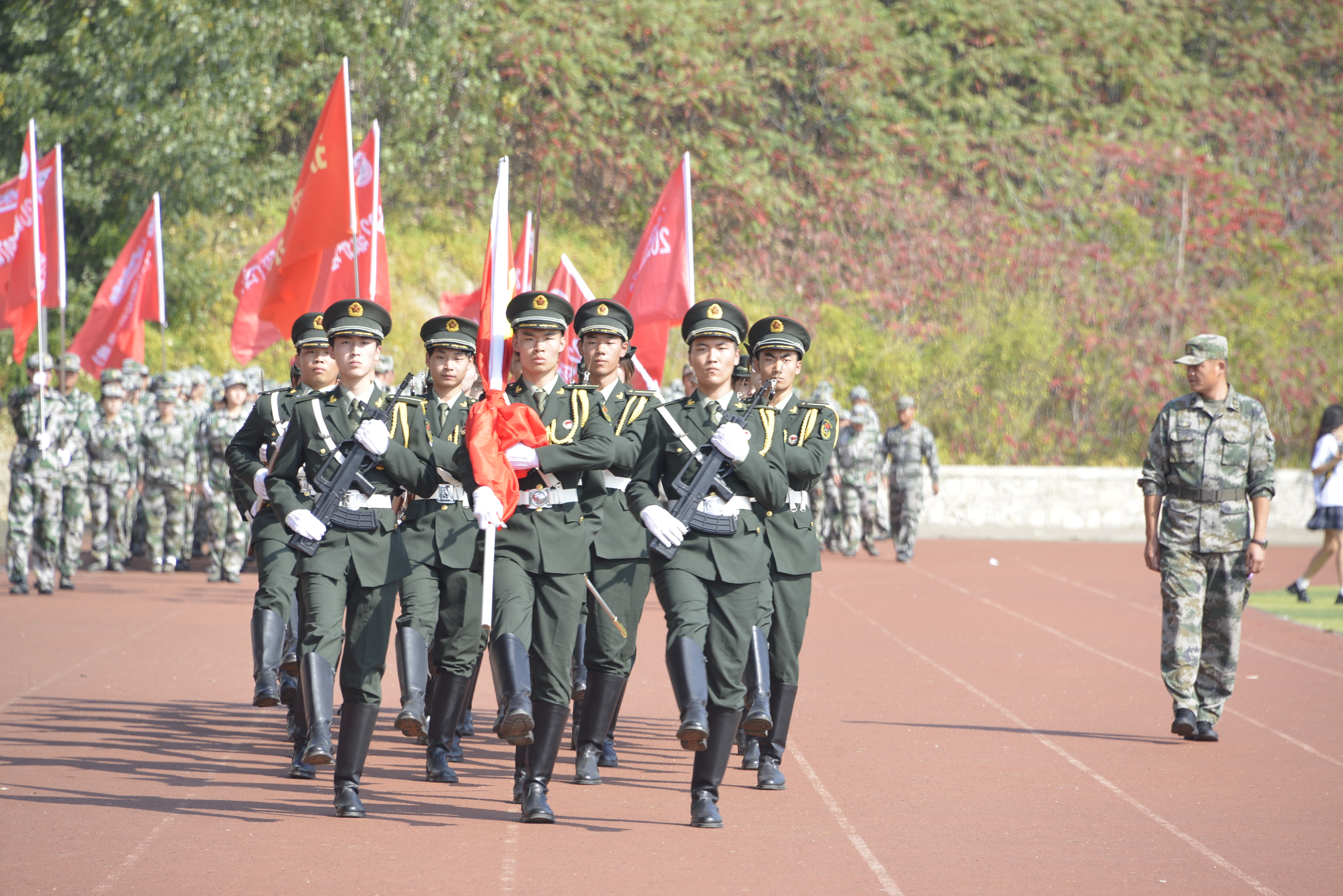 随着指挥员一声令下,展演正式开始,各班训练方阵在操场上迈出整齐的步伐,走过主席台。此后,20名男生现场打出一套形体拳,赢得同学们阵阵喝彩,大家被这种力量与精气神感染,将军训演出拉到小高潮。随着而来的则是女生方队表演的短刀,飒爽英姿,不让须眉,“请党放心,强国有我”的口号便是大家对未来学习、生活的庄严号召。为了给同学们做好榜样,教官们现场表演硬气功,搏斗、力量,每个动作都赢来表达敬佩的掌声。同时,正值全国上下喜迎国庆和党的“二十大”之际,同学们用手中的红色和黄色小旗子为国祝福,共同奋斗新征程。