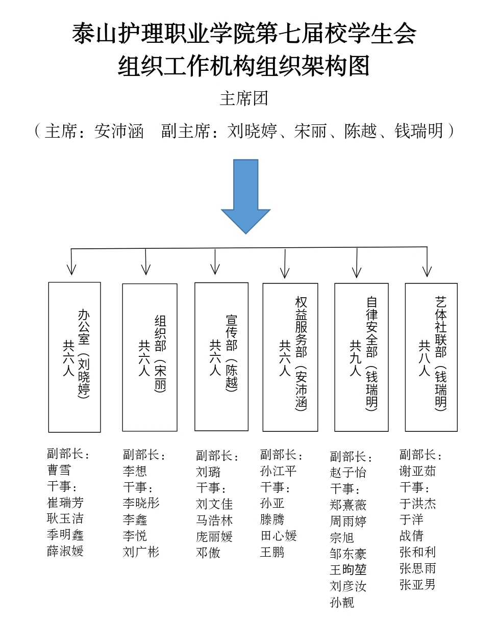 其主要职责为: 执行学代会决议,领导下属各职能部门的日常工作; 第十五条 学生会设主席1人,副主席4人,下设组织部、宣传部、办公室、自律安全部、艺体社联部、权益服务部共六个部门。