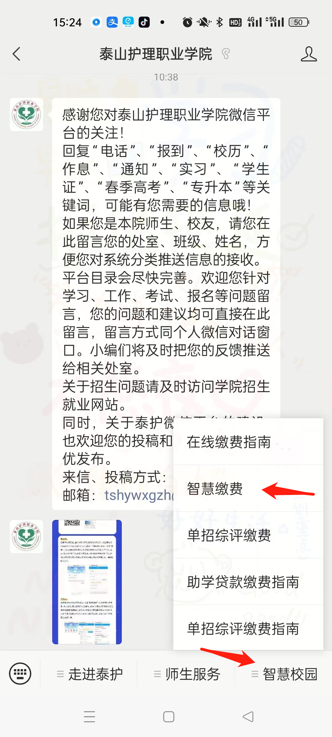 l●打开手机微信APP,扫描下发二维码, 关注“新葡萄8883官网AMG”公众号,点击右下角“智慧校园”—“智慧缴费”进入。