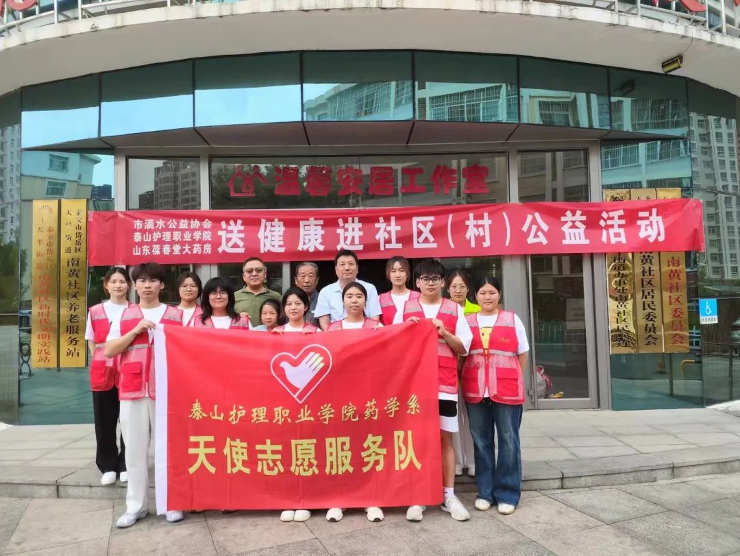 近日,药学系携手泰安市滴水公益协会、山东葆春堂大药房连锁公司在岱岳区南黄社区共同开展了“送健康,进社区(村)”公益活动。药学系部分学生志愿者、滴水公益协会志愿者、葆春堂大药房专业医护志愿人员参加活动。