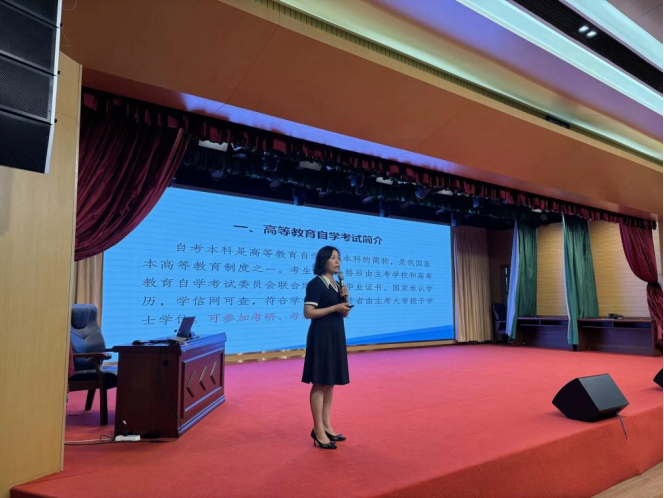 会上,培训部主任夏冰蓉向同学们介绍了今年已取得自考本科学历同学的情况,鼓励大家要坚定信心,勇攀高峰。同时,她围绕自考助学考试的相关政策、考试科目、自考助学优势等方面进行了深入浅出地讲解。