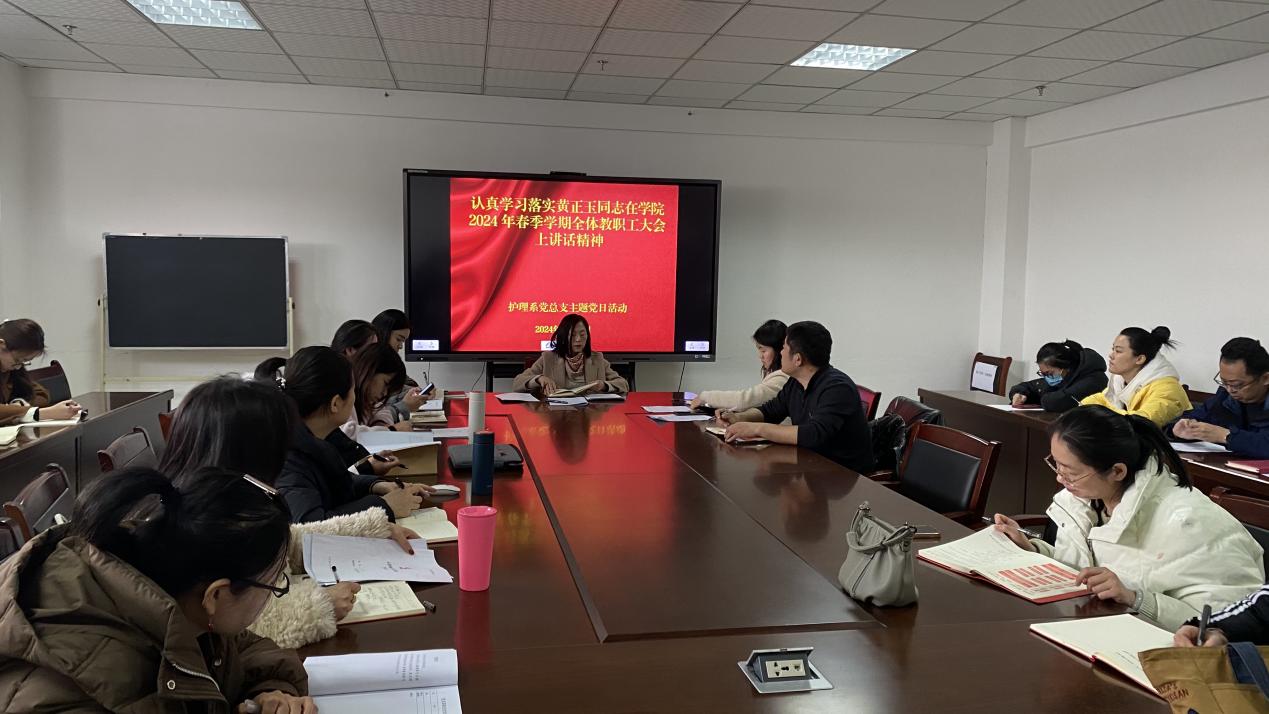 魏春梅带领大家学习落实黄正玉同志在学院 2024 年春季学期全体教职工大会上讲话精神。进一步强调,护理系全体党员教师要聚焦推进中国式现代化这个最大的政治和高质量发展主题,落实立德树人根本任务,突出人才培养和校城融合,深化教育教学教改,为在新的起点上争创“双高”院校奠定坚实基础,加压奋进、攻坚克难、强化担当、压实责任、守牢底线,以良好的精神状态推动各项工作取得新实效。