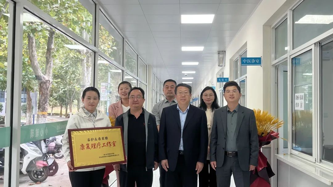 近日,康复系校企合作座谈会在图书信息楼401会议室举行。青岛希莱雅公司李胜副总经理一行与康复系洽谈校企合作事宜。党委委员、副院长王安民为“泰护—希莱雅 康复理疗工作室”揭牌。