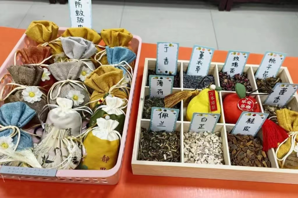 实践手工制作,弘扬传统工艺。药学系结合自身专业特点,指导学生进行药皂、艾叶香囊的手工制作。制作过程中,同学们有的分装药材、香料,穿针引线缝制香包;有的小心翼翼为药皂添加自制的花香精油。闻着药包和手工药皂的香味,欣赏着手中的作品,制作室里欢声笑语伴着各式香包和中药的馨香。