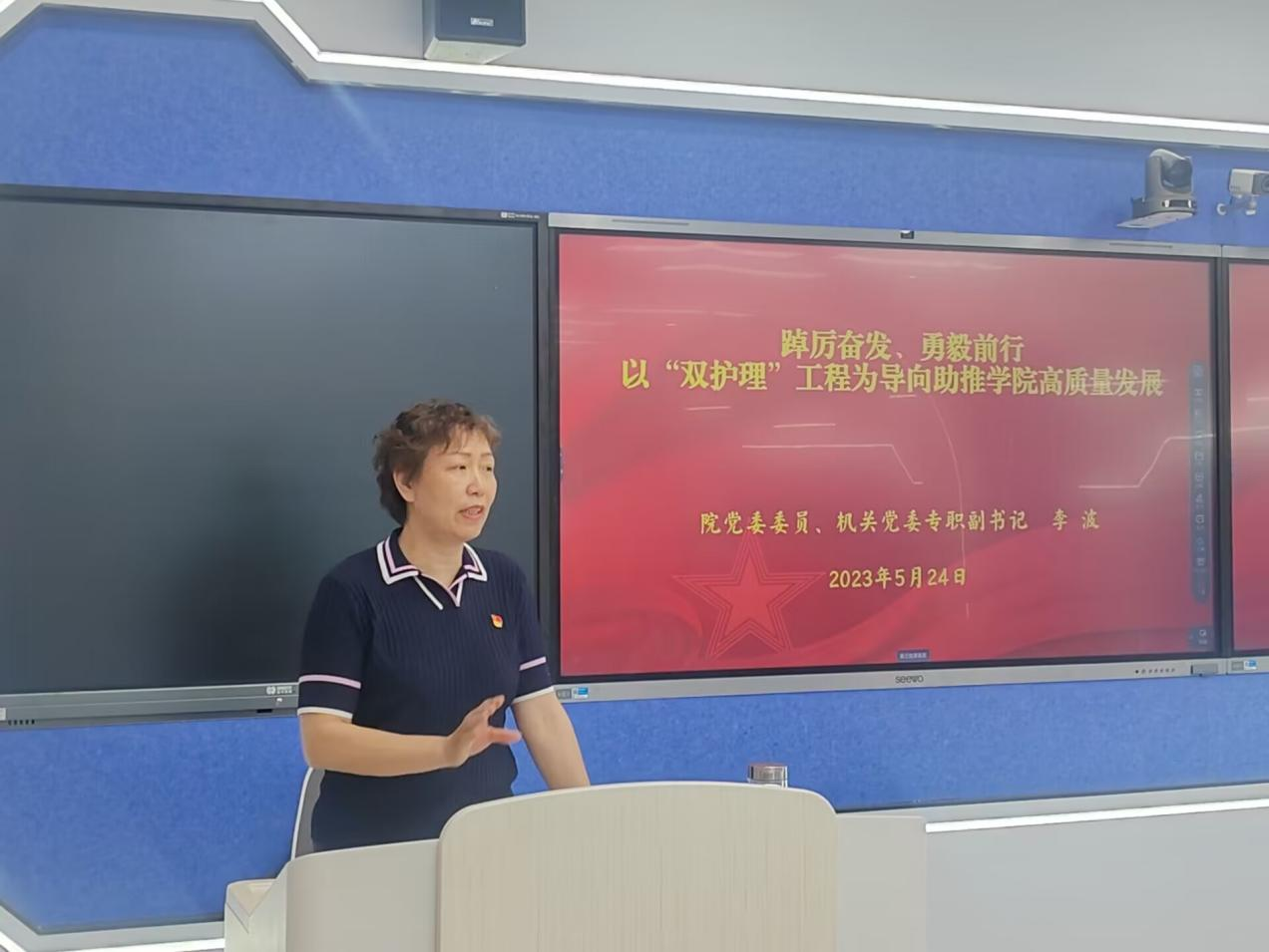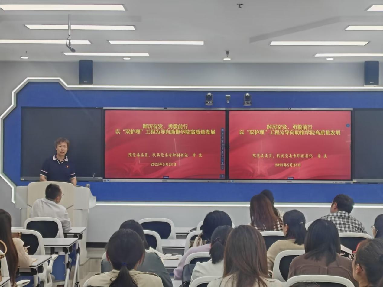 2023年5月24日,学院党委委员、机关党委专职副书记李波来到护理系,开展以“踔厉奋发、勇毅前行——以‘双护理’工程为导向助推学院高质量发展”为题的党课宣讲。护理系党总支书记魏春梅主持本次会议。护理系全体教职工参加会议。