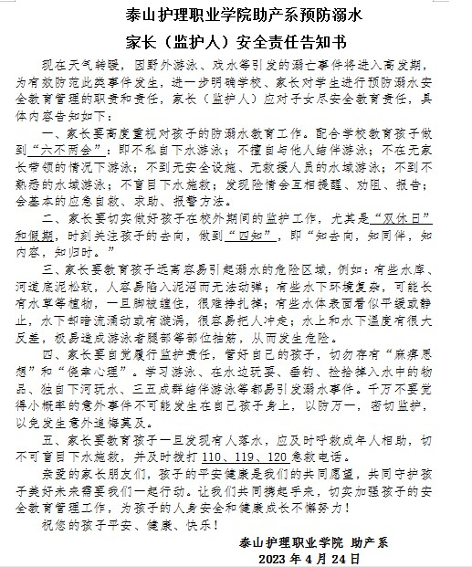 此外,系部在“五一”假期前,通过各班级学生群、家长微信群,发放助产系假期安全提醒书,对假期安全进行提醒,并与家长充分沟通,发放防溺水专项活动致家长的一封信,与家长签订防溺水安全责任书,发挥家校合作管理的最大优势;通过主题团课的形式,开展防溺水专题团课,确保学生对溺水有清楚的底线认识;紧抓日常宿舍安全检查,通过普查与抽查的方式,杜绝安全隐患出现;紧抓晚考勤,通过辅导员、学生干部队伍,坚持每天晚上到学生宿舍清点人数,确保晚归安全。