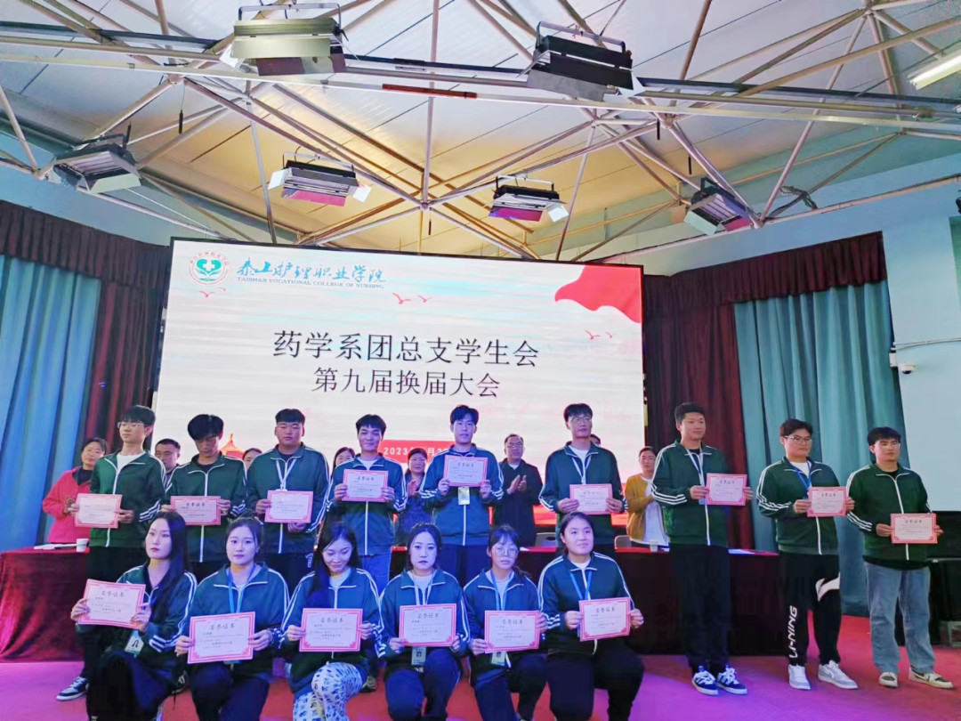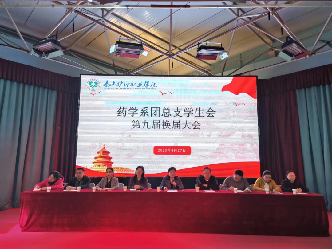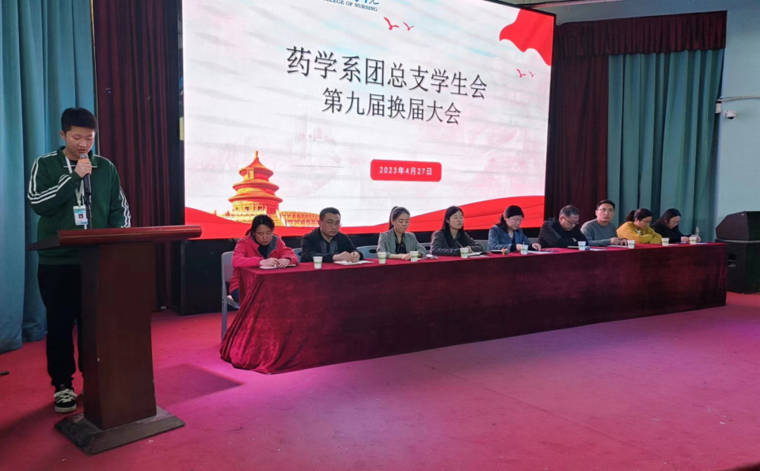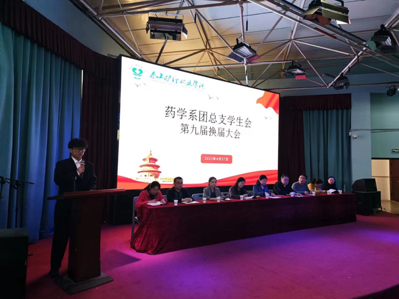 2023年4月27号下午4点药学系在老报告厅举办了第九届学生会换届大会。药学系主任郭静芹、党总支负责人贾汝聪、药学系教学科副科长宋立群、药学系教学秘书王婧及全系学管老师出席了此次活动。