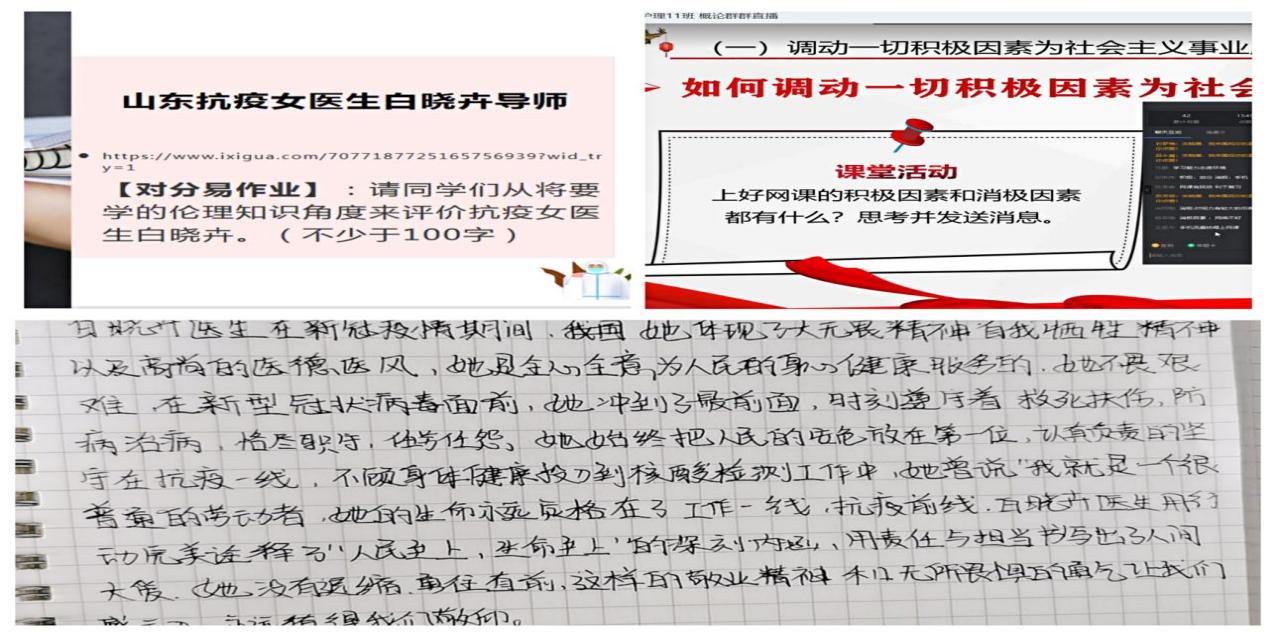 课前,老师们发布温馨提示,提醒上课的注意事项,提供学习素材,帮助学生更好把握所学内容;课中,我们及时挖掘医护领域的榜样人物融入教学,结合“抗疫天使”白晓卉的事迹进行授课,重视讲好抗疫“大思政课”,将“战疫元素”转化为“育人元素”,引导学生进一步树立自信,弘扬伟大抗疫精神,坚定不移听党话、跟党走;课后,我们通过钉钉、QQ、微信等与学生加强沟通交流,询问听课情况,解答疑惑等。