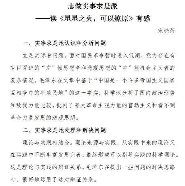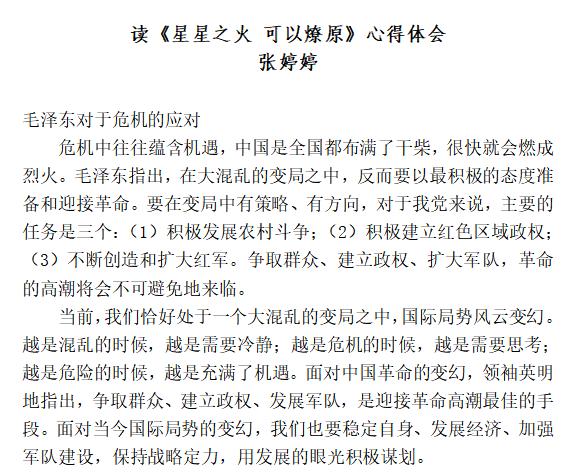 本期读书会分享的名篇来自毛泽东选集第一卷《星星之火 可以燎原》。艾雯静老师为大家进行了详细导读,《星星之火 可以燎原》写于1927年大革命失败以后,针对党内盲动主义和“红旗到底打多久”的两种错误思潮,毛泽东客观分析了敌我形势的变化,提出无产阶级革命发展的可能性和必然性,艾雯静老师通过五个思考问题引导老师们思考讨论,思政部全体教师集体分享了阅读心得。思政部主任王英南对读书活动进行总结:高校思政课教师承担着思想政治教育的重要使命,“打铁先得自身硬”,读原著学经典是青年教师提高马克思主义理论素养的基本功,只有真学、真懂、真信、真用,才能更好地承担思政课的教学任务,真正成为“政治强、情怀深、思维新、视野广、自律严、人格正”的新时代思政教师。