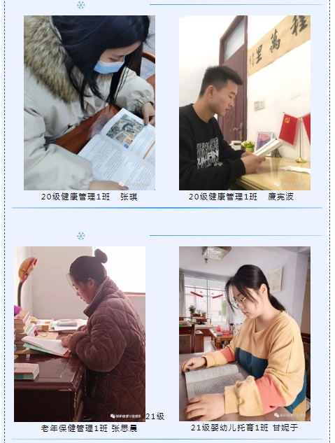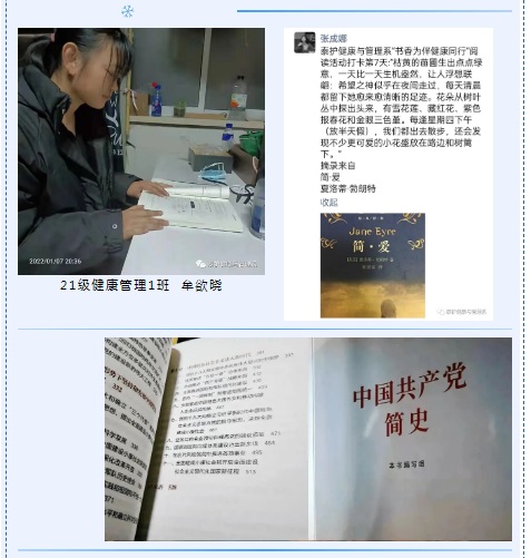 阅读活动同学们感触颇多:20级健康管理1班廉宪波同学说,和书籍接触得愈亲密,便愈加深刻地感到生活的美好。21级老年保健管理1班张思晨同学说,当我第一遍读一本好书的时候,我仿佛觉得找到了一个朋友。21级健康管理3班刘晓同学说,自己一直坚持阅读,读书让自己内心笃定却又不过于固执,让自己看见他人眼中的世界,也学会了审视自己。重温党史,感知先辈的求学艰辛、人民对美好生活的向往、前人对革命的呼唤以及中国共产党执政的历史必然性,只有共产党才能带领人民脱离苦难,走上幸福美好之路。