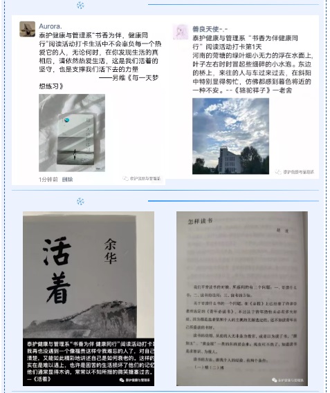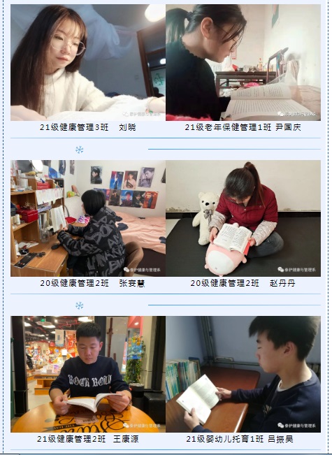 阅读活动包括“自主阅读”和“教师领读”两个部分,同学们根据自己需求自行选择。在领读活动中,健康与管理系部分教师组成领读团队,每周一根据阅读主题或书目进行领读,团队老师包括:仇冰洁、刘一奇、钱洁莹、崔玉芬、吴世蕾、高旭、姜澍霏等。活动已于2022年1月1日开始,截至目前,共有150多位同学踊跃参加,手捧书本,文字跃然,或品历史之厚重,或赏诗词之美韵,或听先辈之教诲……