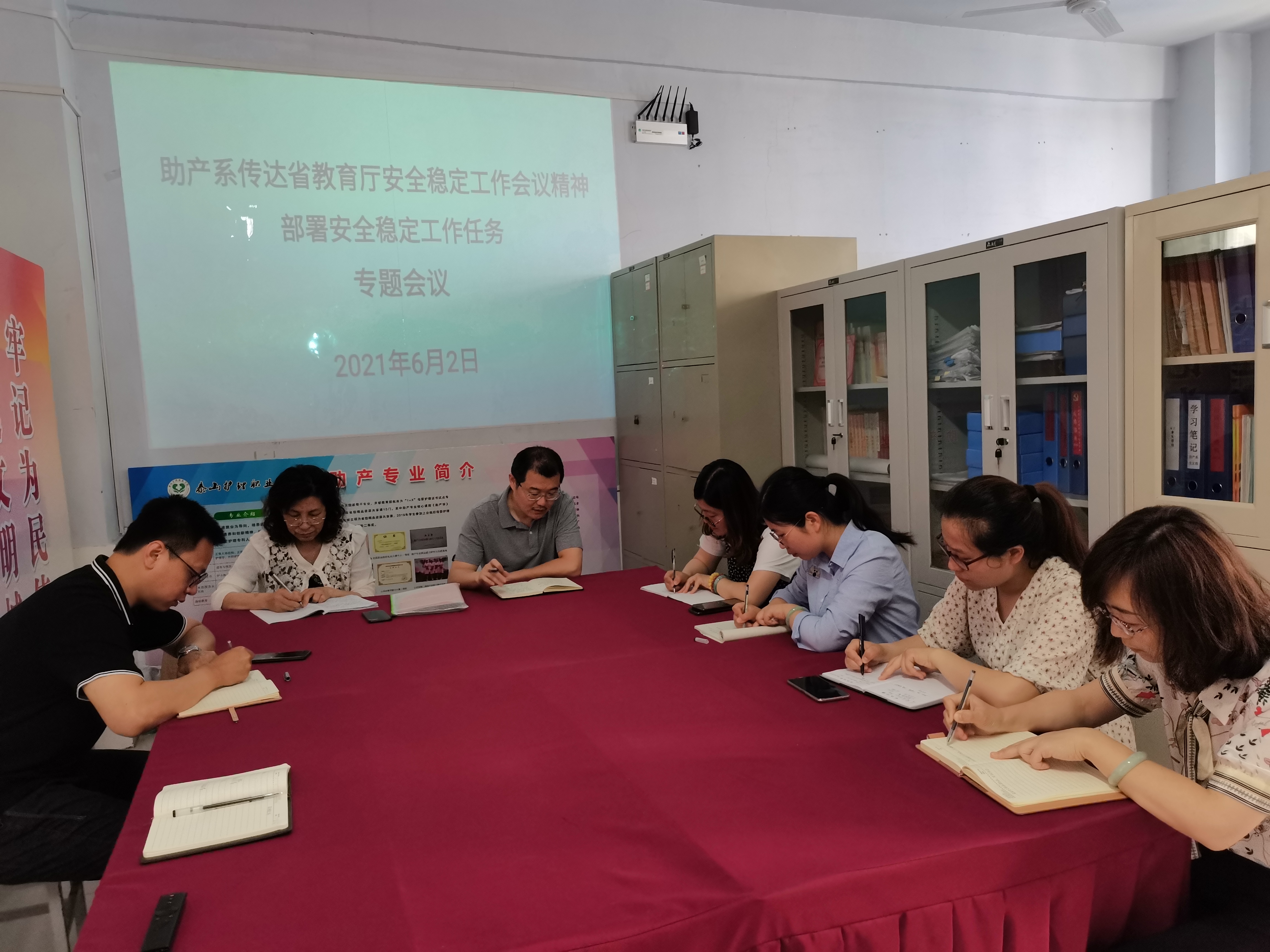 6月2日上午9:00,助产系组织召开安全稳定工作专题会议,传达省教育厅安全稳定工作会议精神,部署近期安全稳定工作。助产系主任陈青、副主任于泳、学生科副科长杜月,全体辅导员及在校班级班主任参加会议,于泳主持会议。